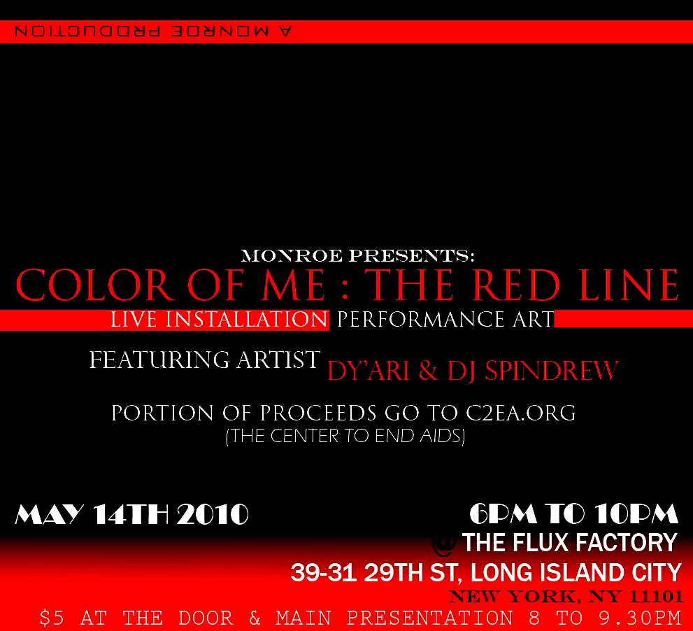 If you don’t have anything planned this friday May 14th, 2010, Spikes & Sequins has the perfect event for you to attend. If you would like to be inspired, entertained and cultured please check out “COLOR OF ME: the red line”. “COLOR OF ME: the red line” is a performance art installation produced and directed by our multitalented friend Monroe of Monroe music (www.facebook.com/monroe.monroe).