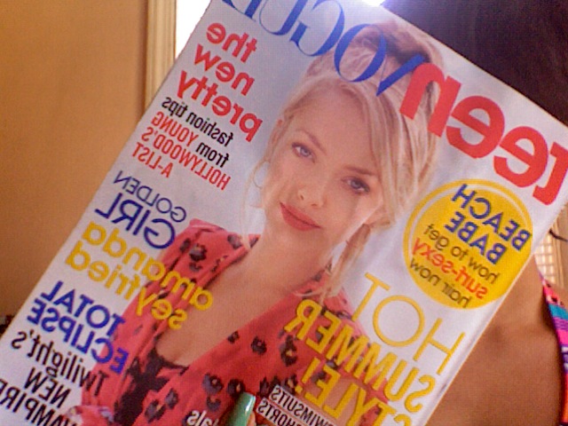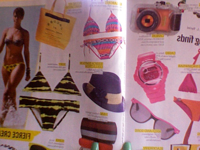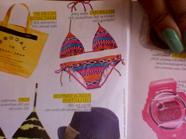 Another one of my finds in Virginia was this Billabong bright colored ethnic print swimsuit! I LOVE bright colors for swimsuits. The whole set was only $24.50 from TJ Maxx! BAH-gain! Well, today I was reading the June/July issue of Teen Vogue and I can’t believe it but my Billabong swimsuit is one of their picks for the summer “Beach Bag Finds“!!!! Only thing is the top and bottom are $40.00 each!!! CRAZY!