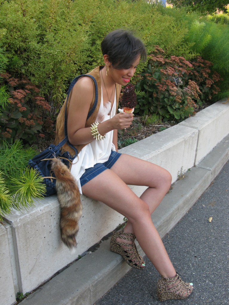 I’m very proud of myself because this is the first time I wore my foxtail. I really like the look of a foxtail as a keychain for your purse or jeans. I ordered it months ago but when I opened the box I discovered my fear of furry things! I couldn’t touch it, look at it or even sit next to me without FREAKING out! When I put together this outfit I said to myself “something’s missing!?”…”my foxtail!” The foxtail was like the cherry on top for my outfit! I had to conquer my fear in order to complete my outfit!!! So, I asked Sequins to take it out the box and clip it onto my purse because I wasn’t brave enough to do it myself. Haha Thank you Sequins! Eventually, throughout the day I got use to this little furry fella and now we’re friends.