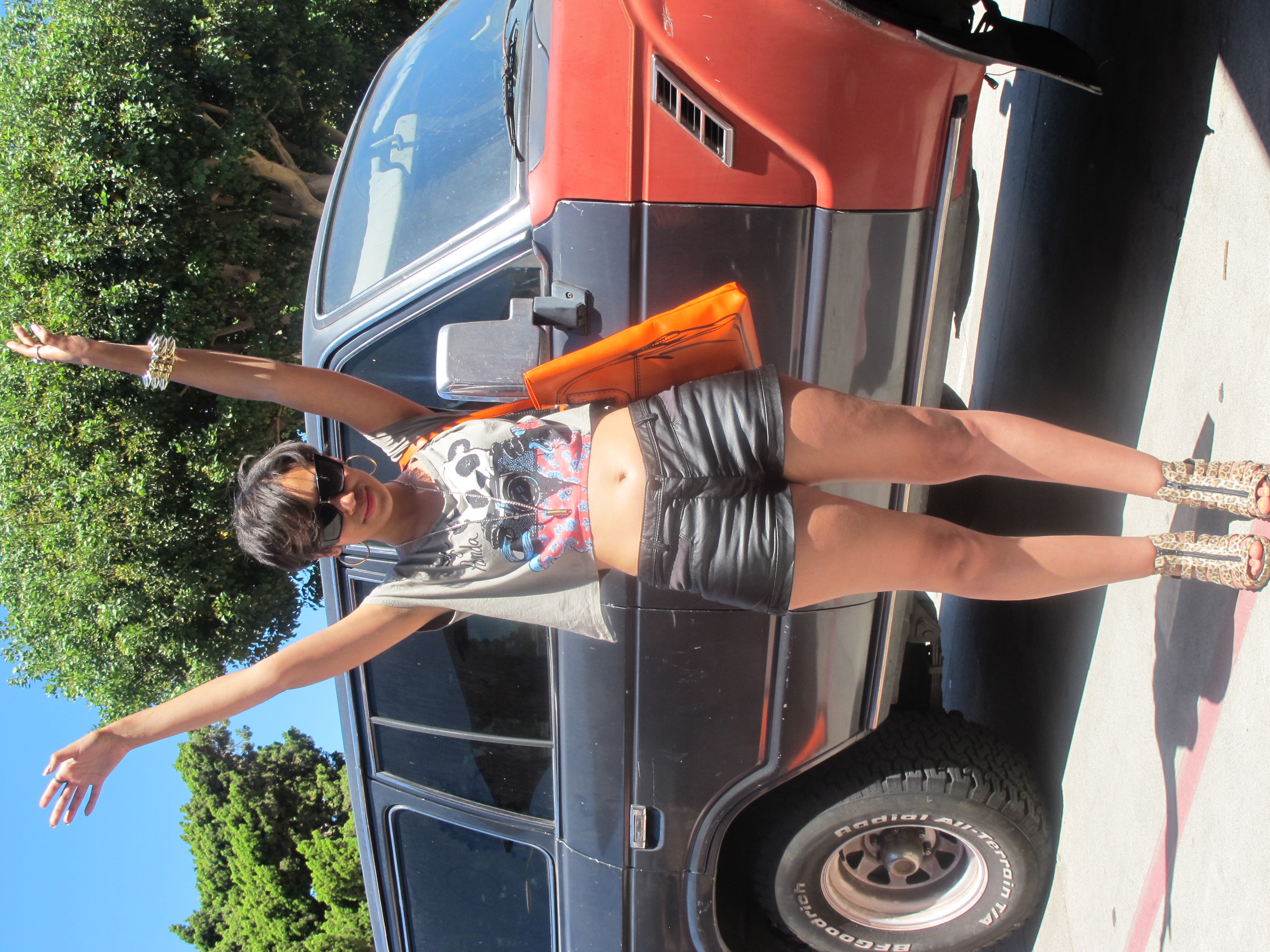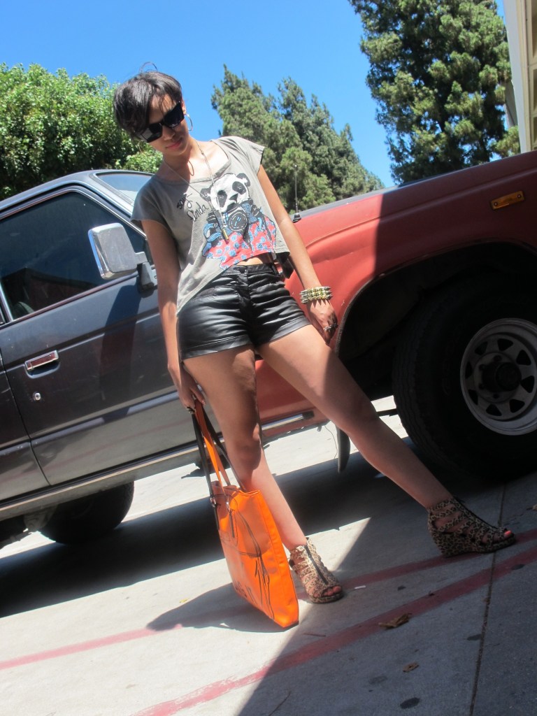 August 24, 2010August 24, 2010 LA Outfit-2 Sunglasses from F21, Shorts and shoes from H&M, Panda Top from LF stores, Spikes bracelet from Redress, Bullet Necklace from Detroit Trash and Skull Rings from Melrose Trading Post Share this: Click to share on Facebook (Opens in new window) Facebook Click to share on X (Opens in new window) X Like Loading... Related