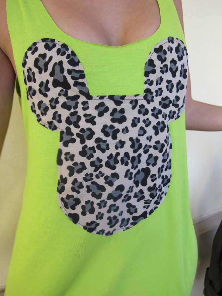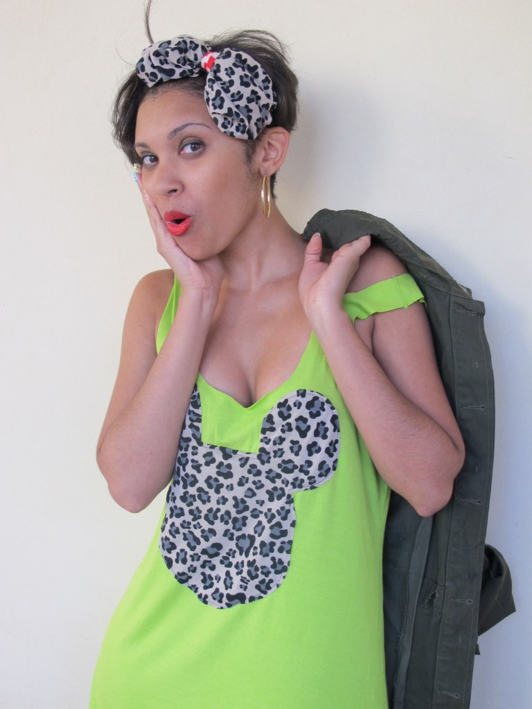 I fell in love with this tank… Anything with Leopard + Mickey= A Keeper! Then, I saw a matching Bow headband and I was SOLD! Tank was $25.00 and the Headband was only $10.00! Today, I whooped out my cute tank with matching headband, paired it mesh bicycle shorts and army jacket! I received many compliments on my tank & headband today!