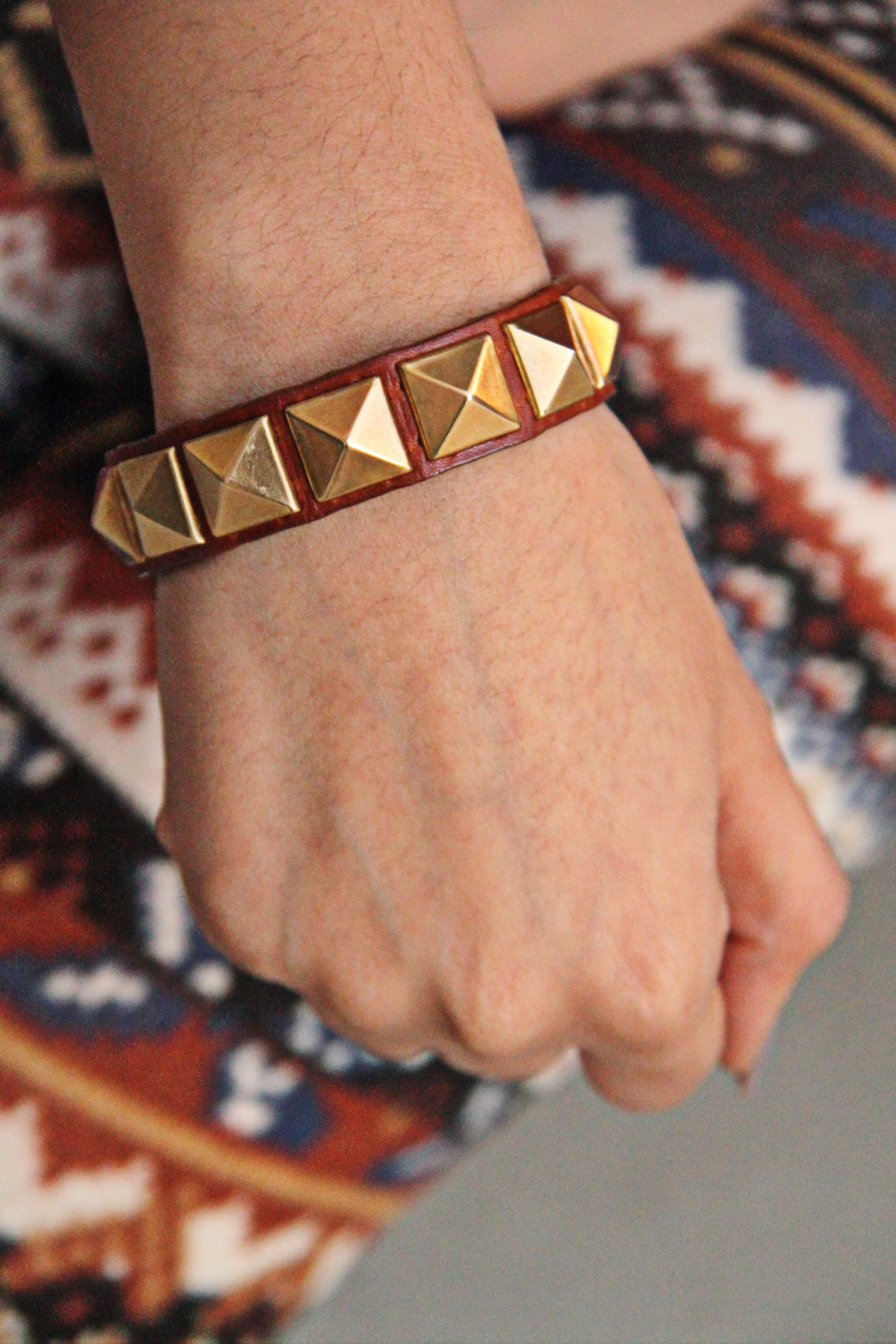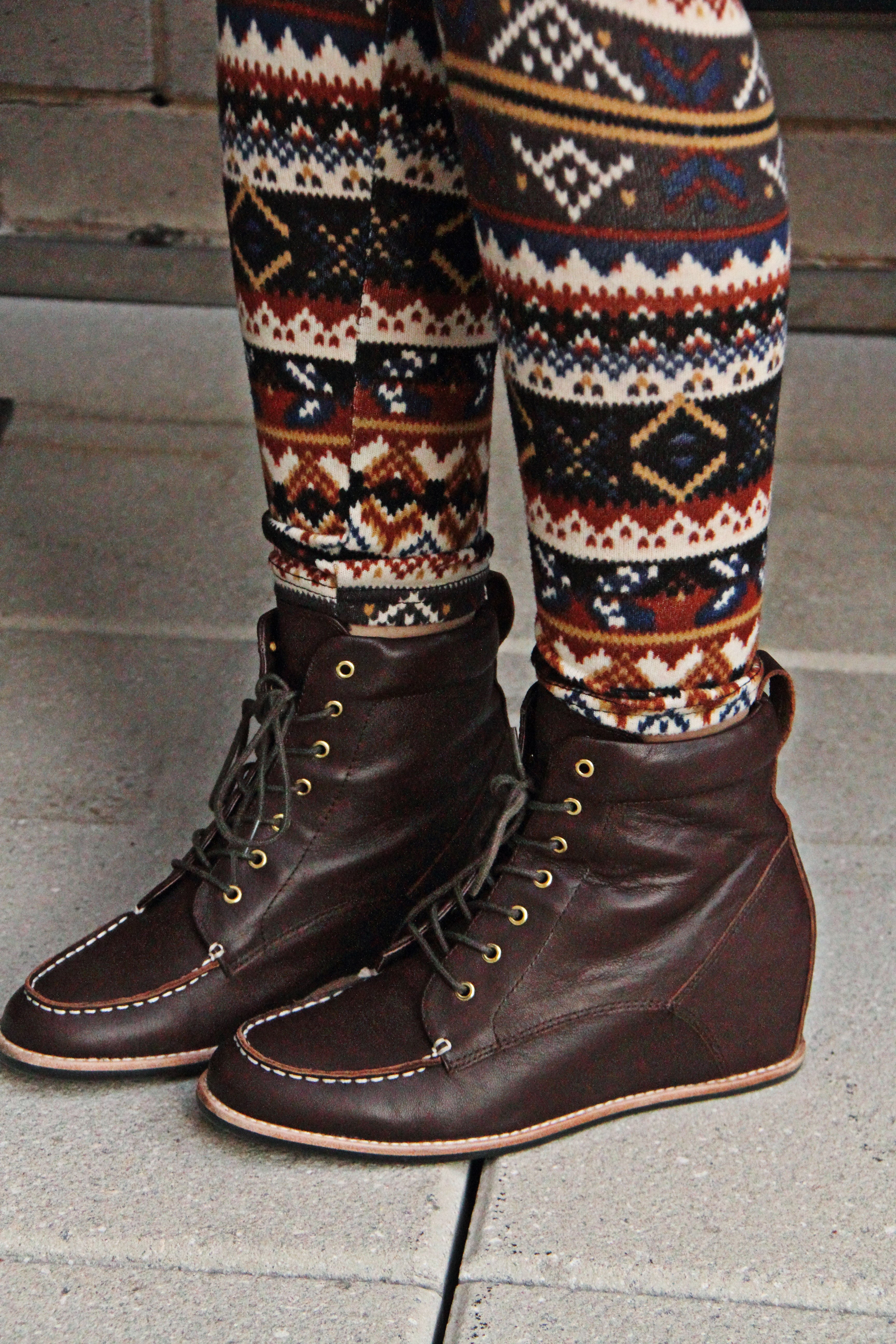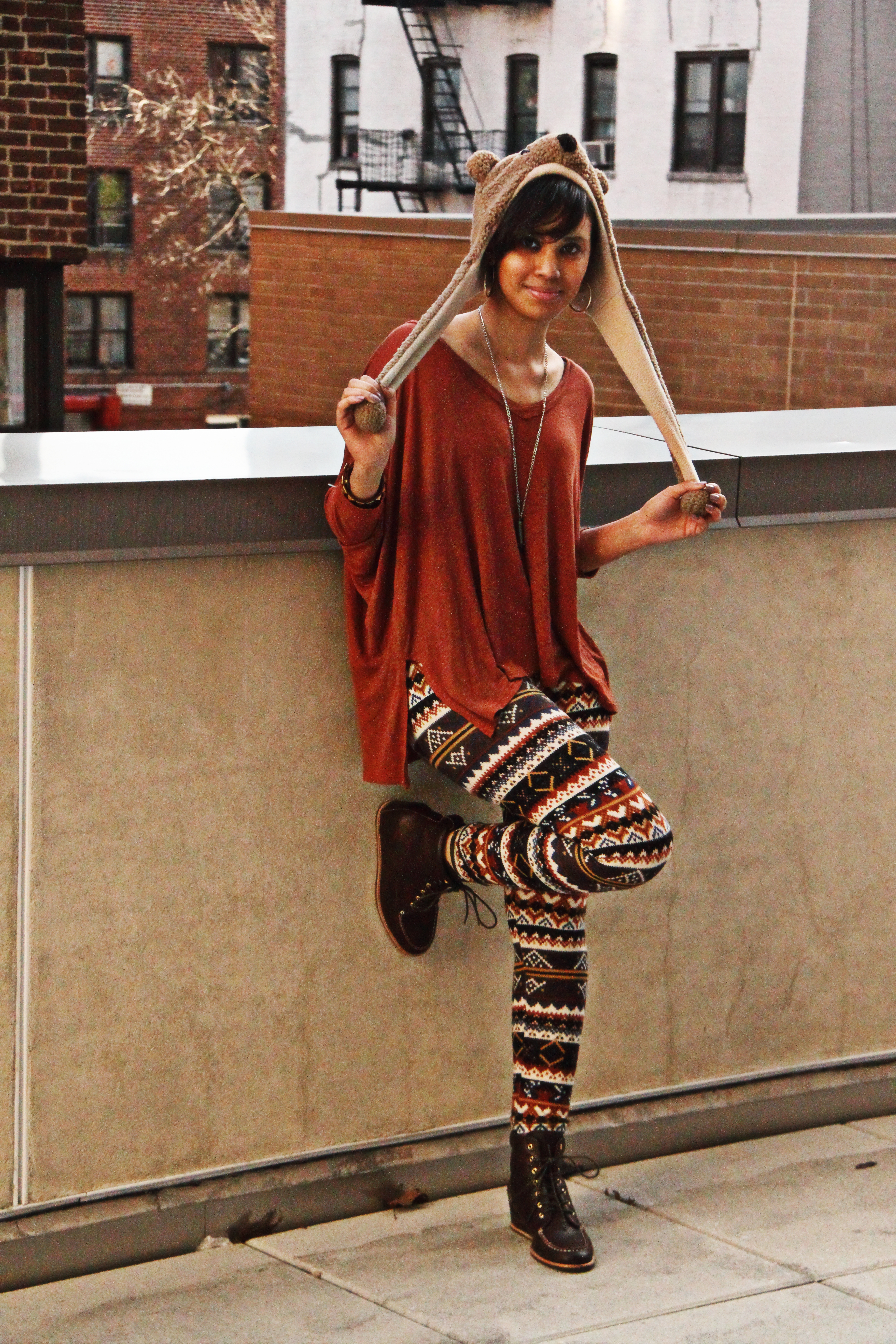 Teddy bear hat, studded leather bracelet, drapey top, Nordic leggings, “Ronnie” wedge boots by Matiko ALL from LF