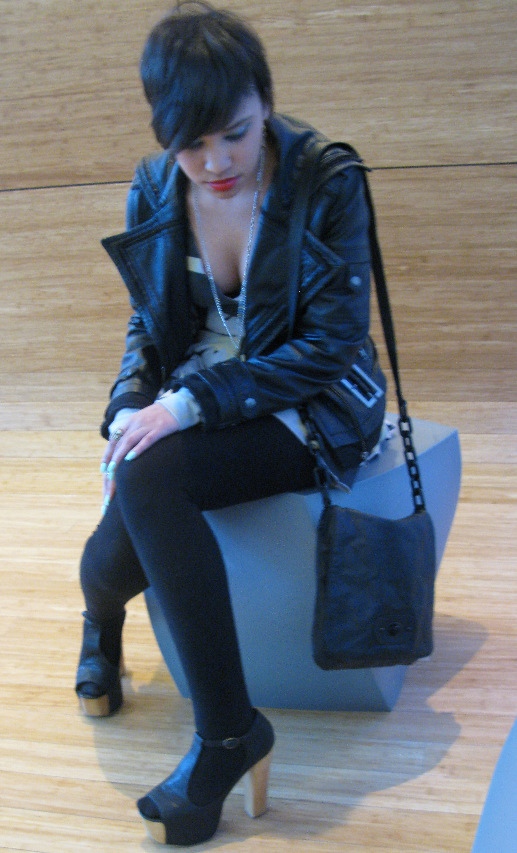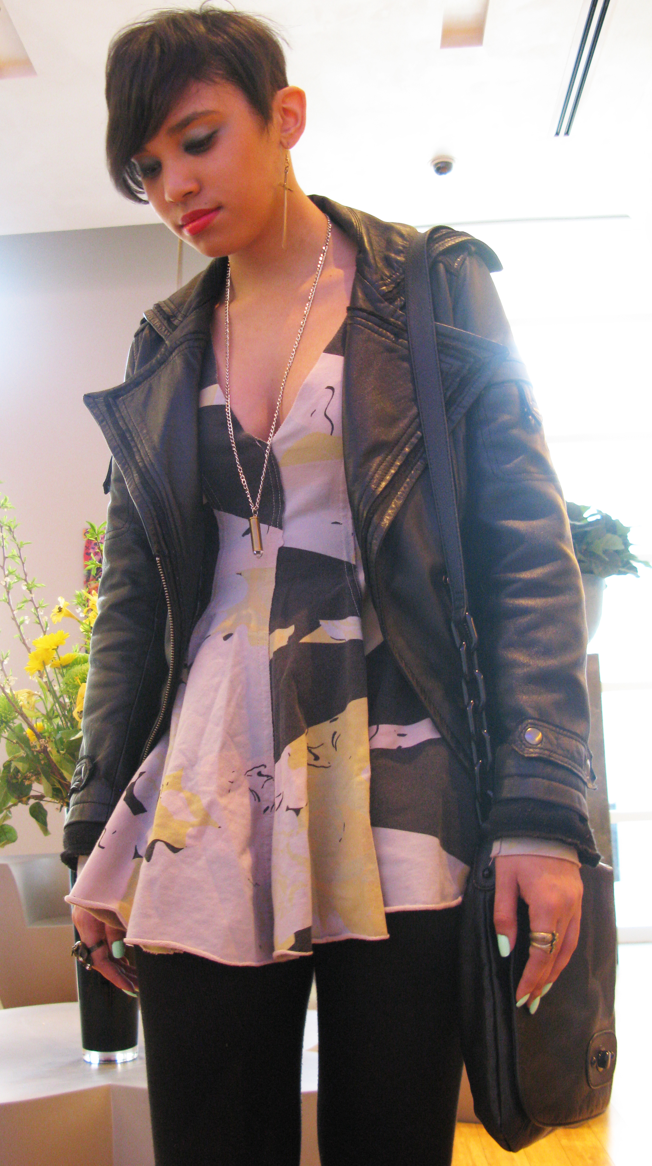 This weekend I went the LES for the gallery opening of pop art Artist Josh Williams. Josh is one of Dave’s friends from Pratt so of course we had to go support Josh and his amazing work! (Look for Josh Williams’ Artist of the Month post soon) I decided to wear Seneca Rising’s Deene dress from Edge of Urge. I thought it’d be perfect to wear because the colors and shapes reminded me of pop art. I accessorized it with a bullet chain necklace by Detroit Trash, sword earrings and rings from my trip in LA, motor leather jacket, shoes by Jeffrey Campbell and crossbody bag by H&M.