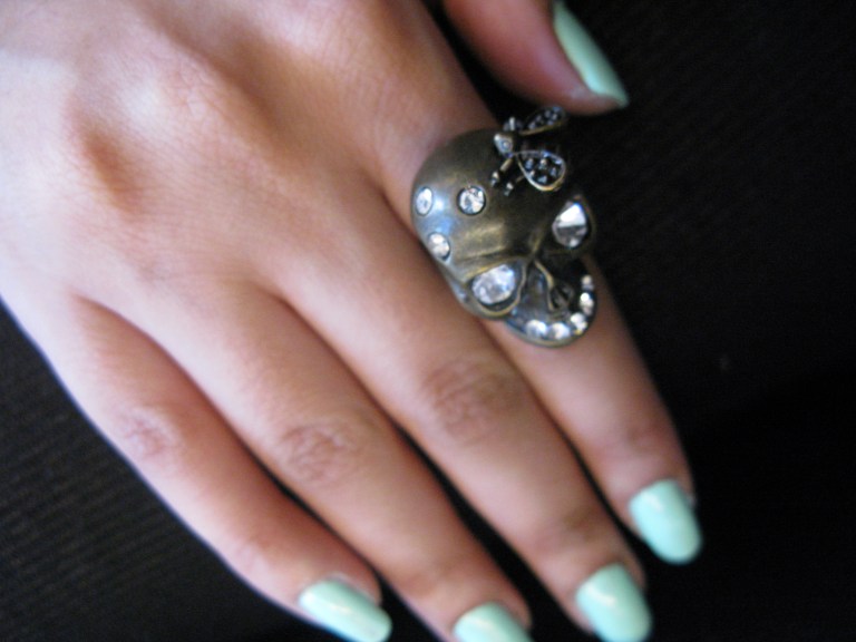 I went to the nail salon and spotted the color and begged to buy it. Unfortunately it doesn’t have a label on it. I do know Essie has a mint green color called “Mint Apple Green” that is very similar. Sorry 😦