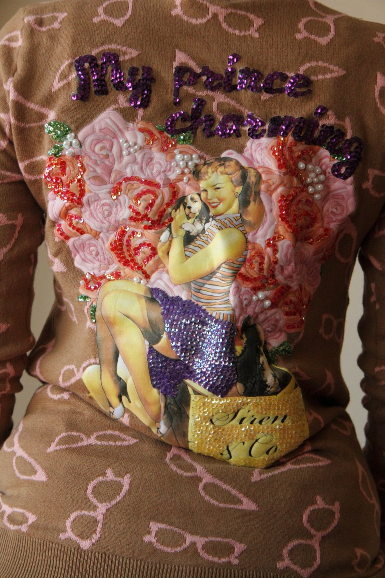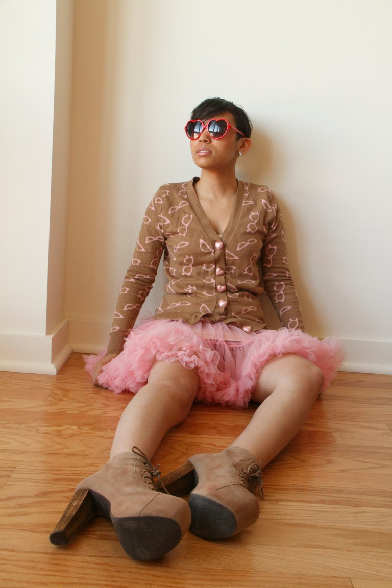 My first gift is the Selena “My Prince Charming” beaded cardigan! This vintage inspired beautiful cardigan is woven in a cat eye glasses print, trimmed in pearlized pink heart shaped buttons and embellished with hand beading and print on the back! It has an extremely soft handfeel and comfortable to wear. I paired it with a pink tutu, heart shaped pillbox headband w/ vail and JC Lita platforms! I also plan on wearing this cardigan with a pair of skinny jeans, a tank and geeky spectacles. I feel head of the class in this cardi 😉 I’m in love…