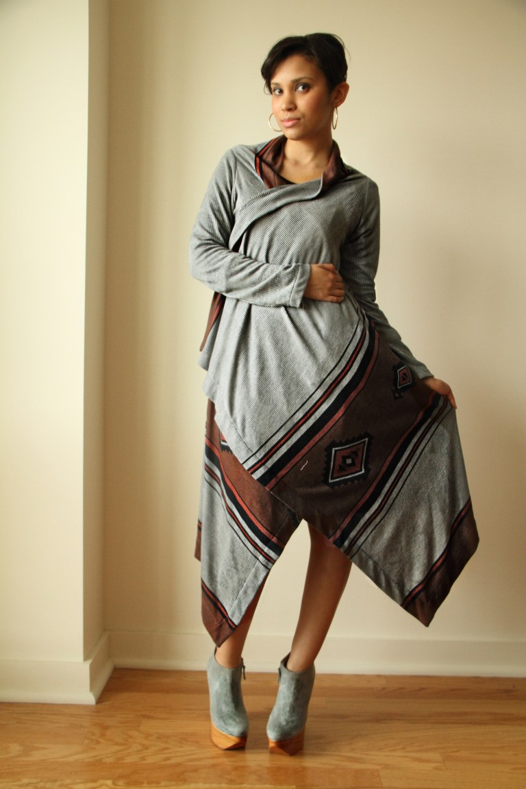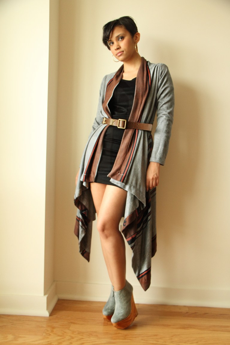 I’m wearing the Cyclops fold dress by Oscar the Third, the Inca Poncho by Goddess of Babylon, and Pheonix wedge by Maurie & Eve. I styled the pieces with my own belt by Betsey Johnson.