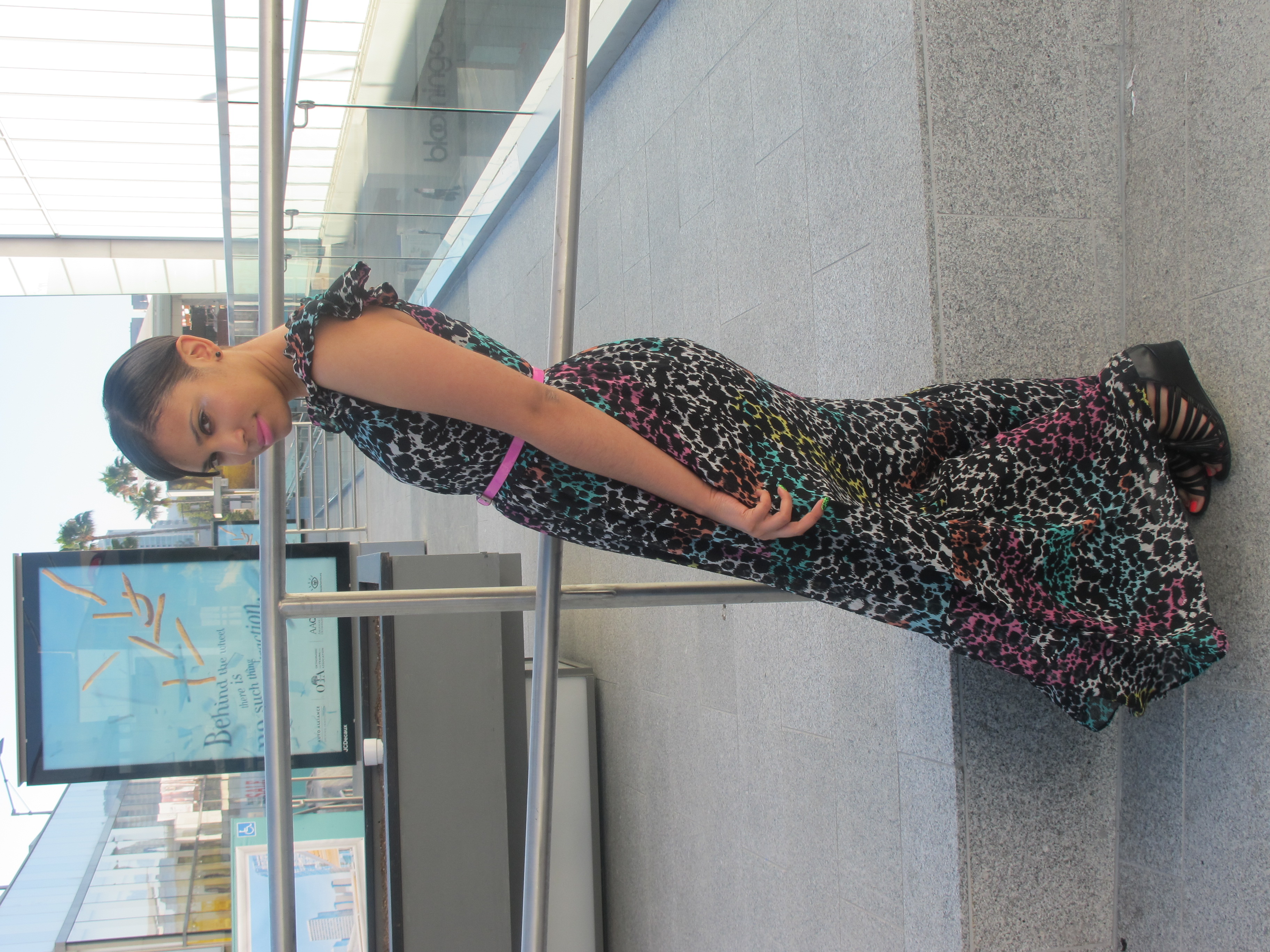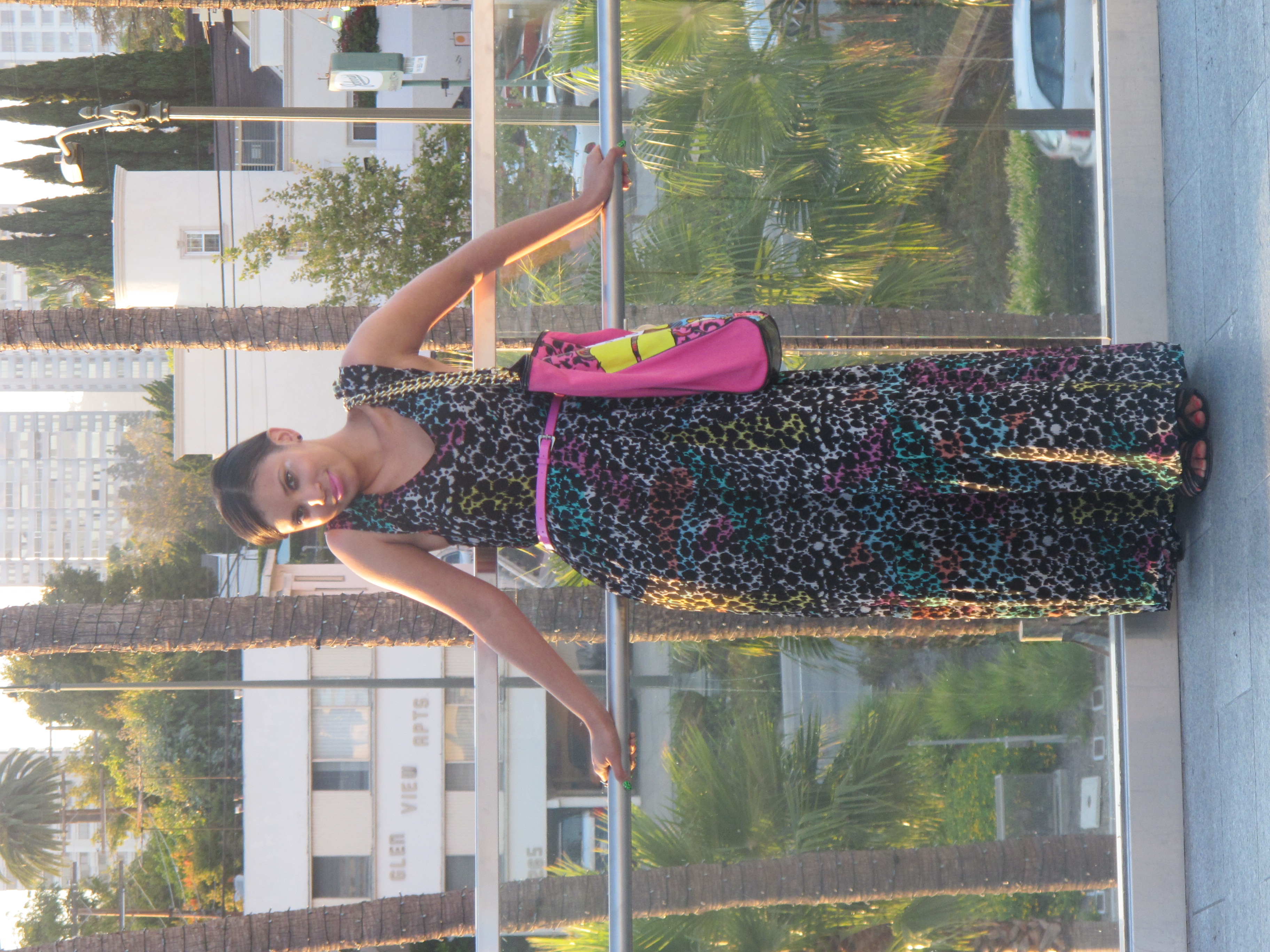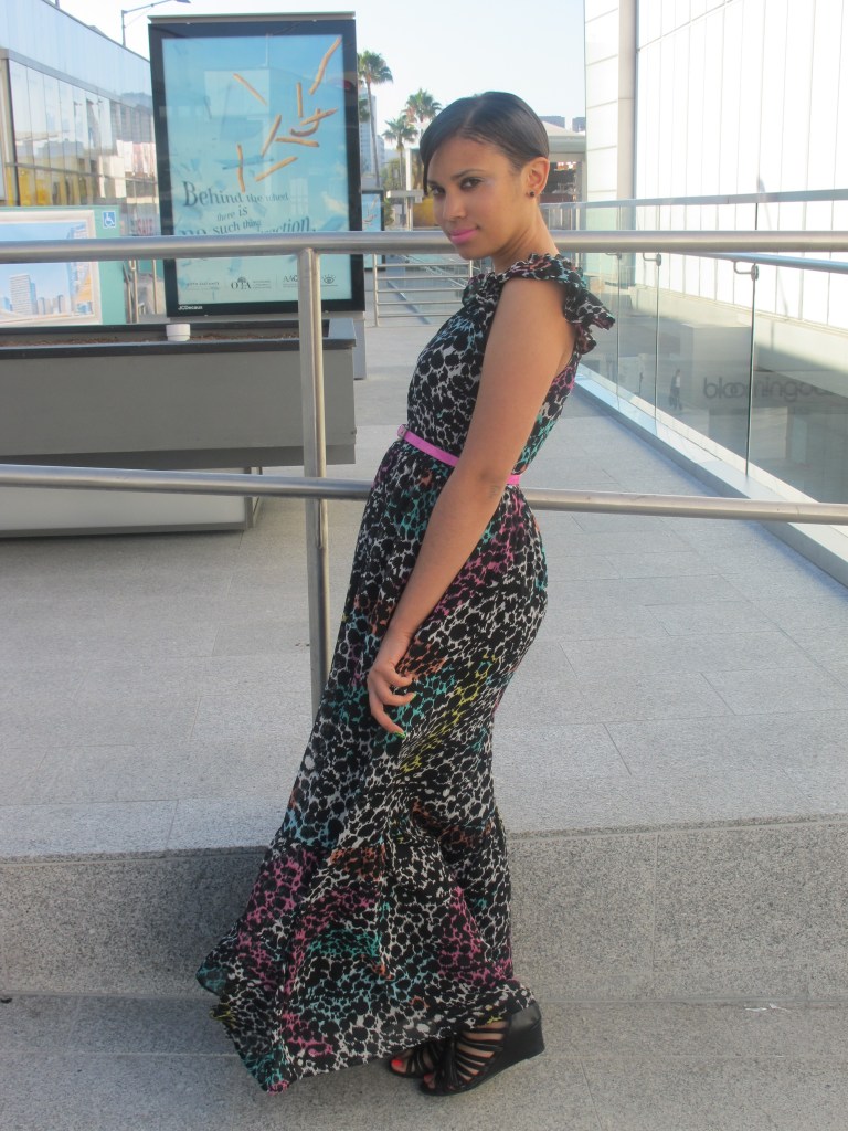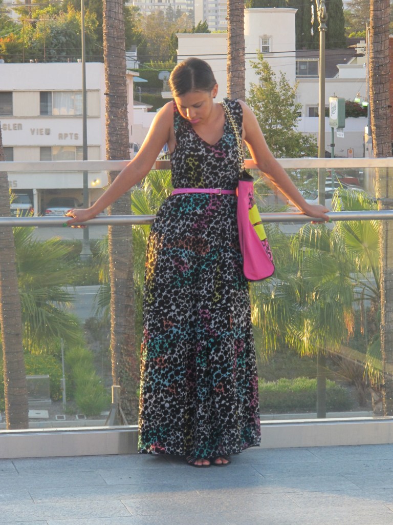 That day Tiff and I maxed it out again and wore maxi dresses! I wore a leopard print maxi dress by Romeo and Juliet Couture. To synch my waist I added a hot pink patent belt. Bag by Betsey Johnson and shoes by Dolce Vita.