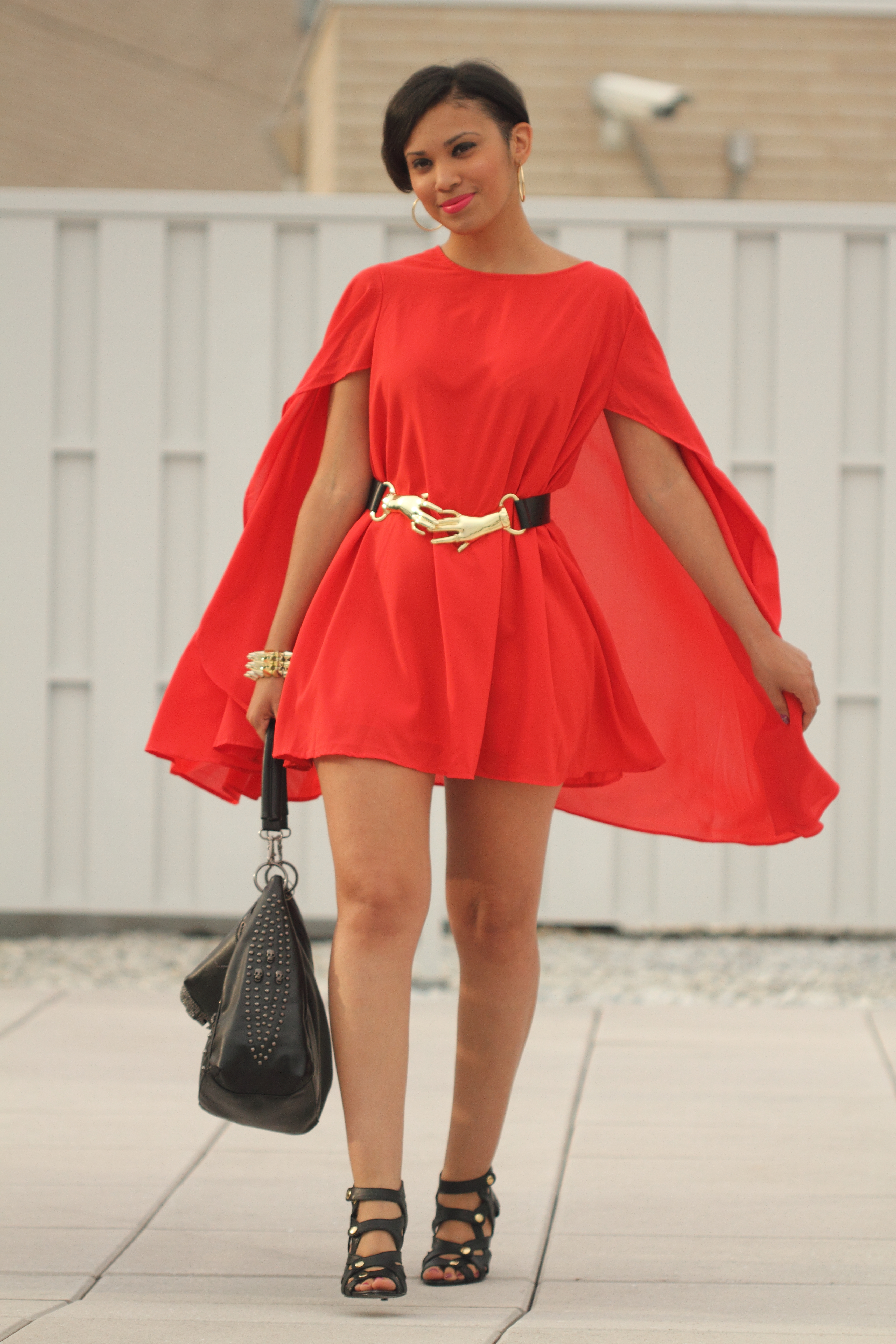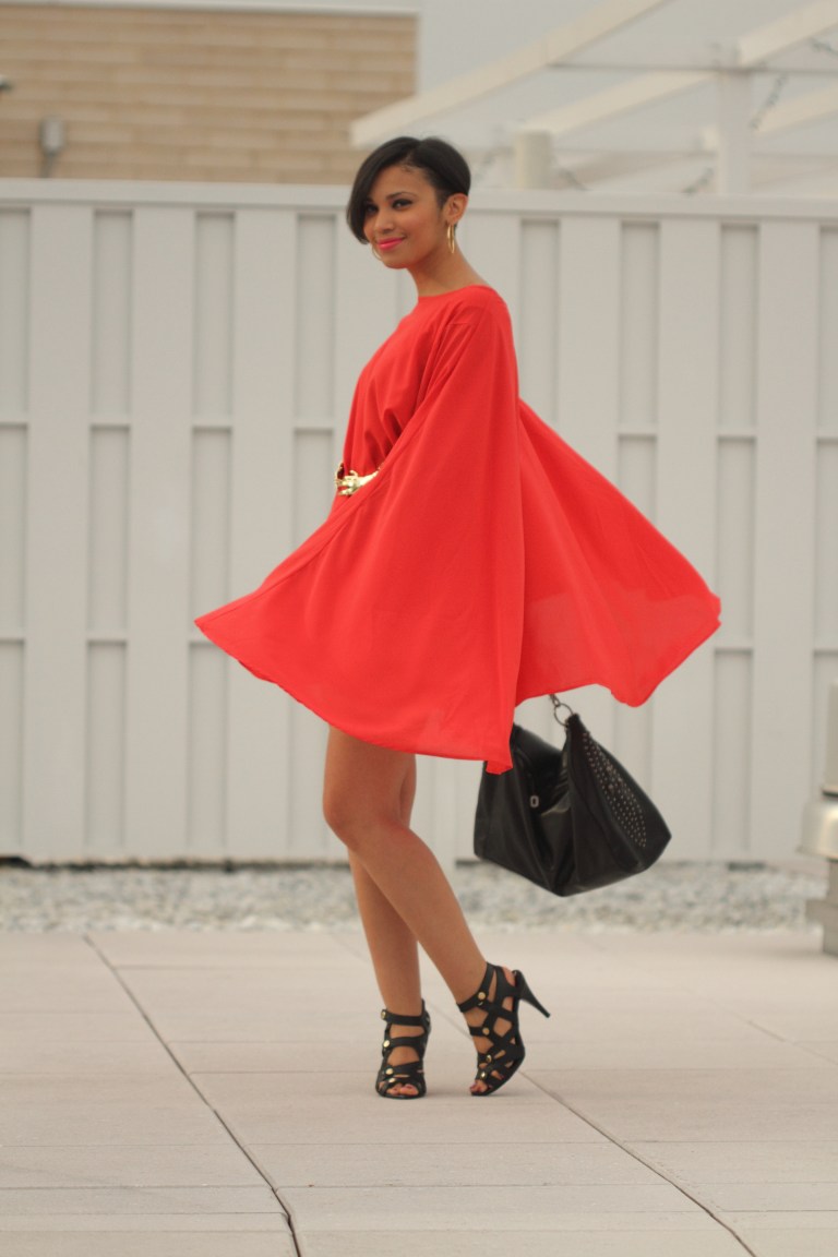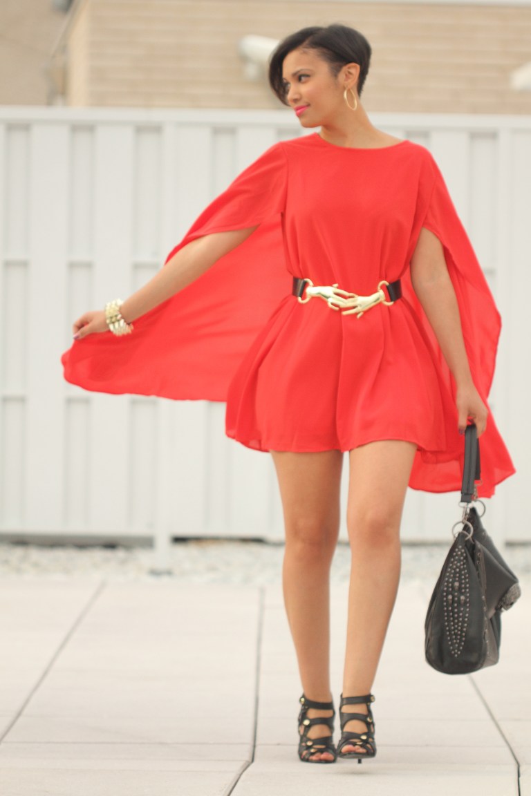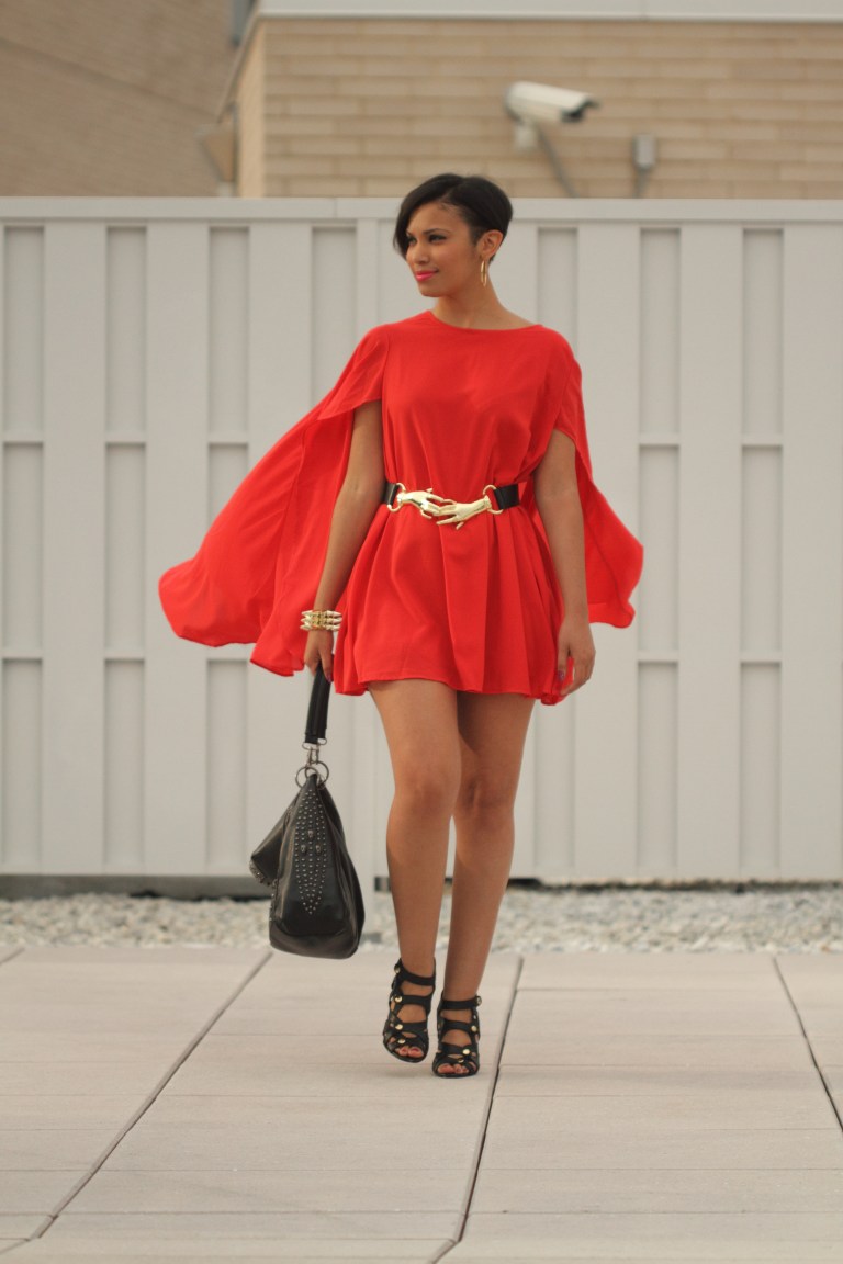 This is the 7th and final look (aw so sad 😦 ) for the Siren London’s “Seven Day Siren Challenge“! I’m wearing the fierce flaming Hero Day Dress. This dress is statement piece. I really love it’s bold bright red color. It has a cape-like top that drapes beautifully over the dress. The chiffon fabric adds movement and drama as you walk! LOVE! LOVE! The dress is very full so I added a belt to cinch the waist for more shape and then added a few other gold accents. I’m also wearing my newest obsession the Rhianna bag.