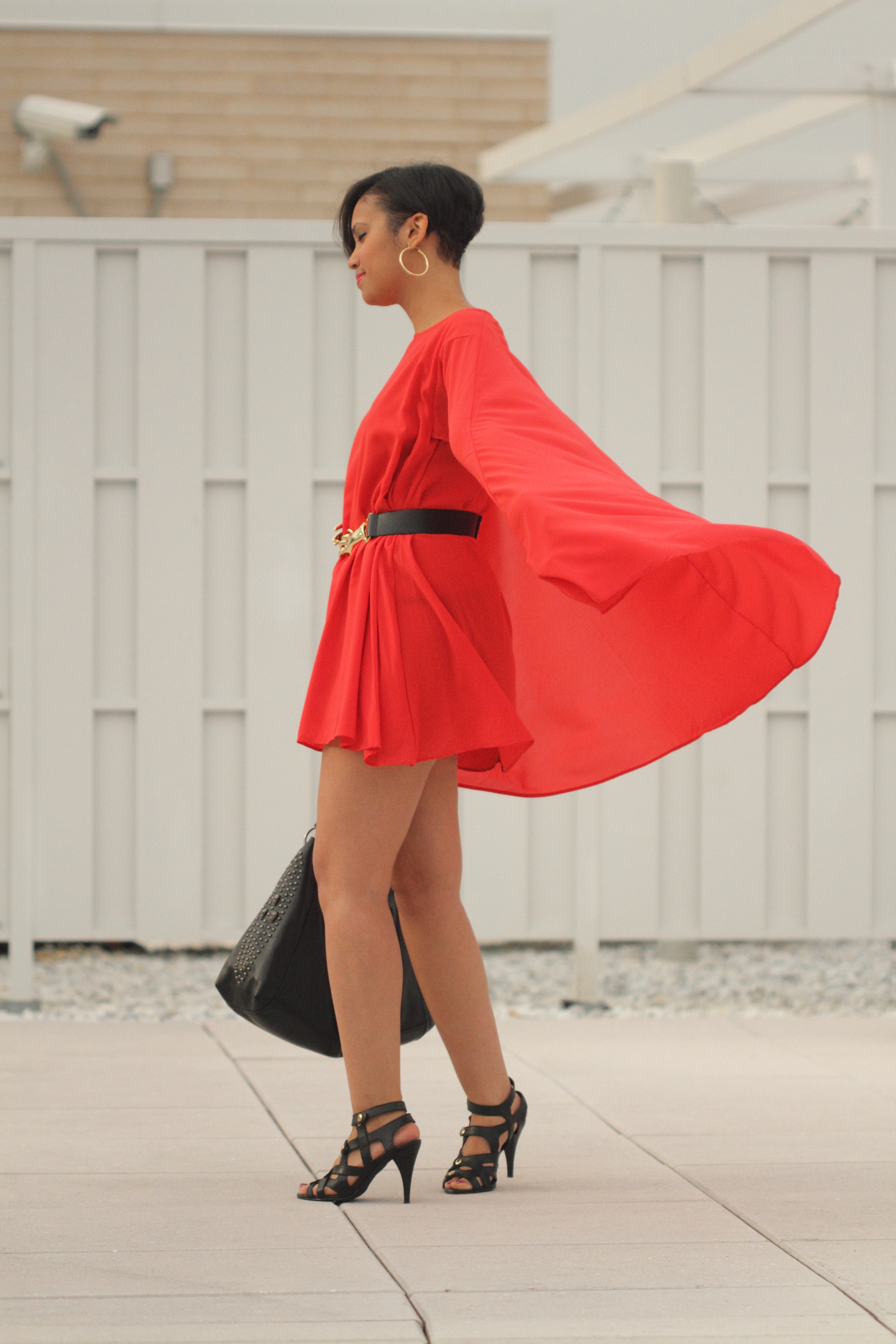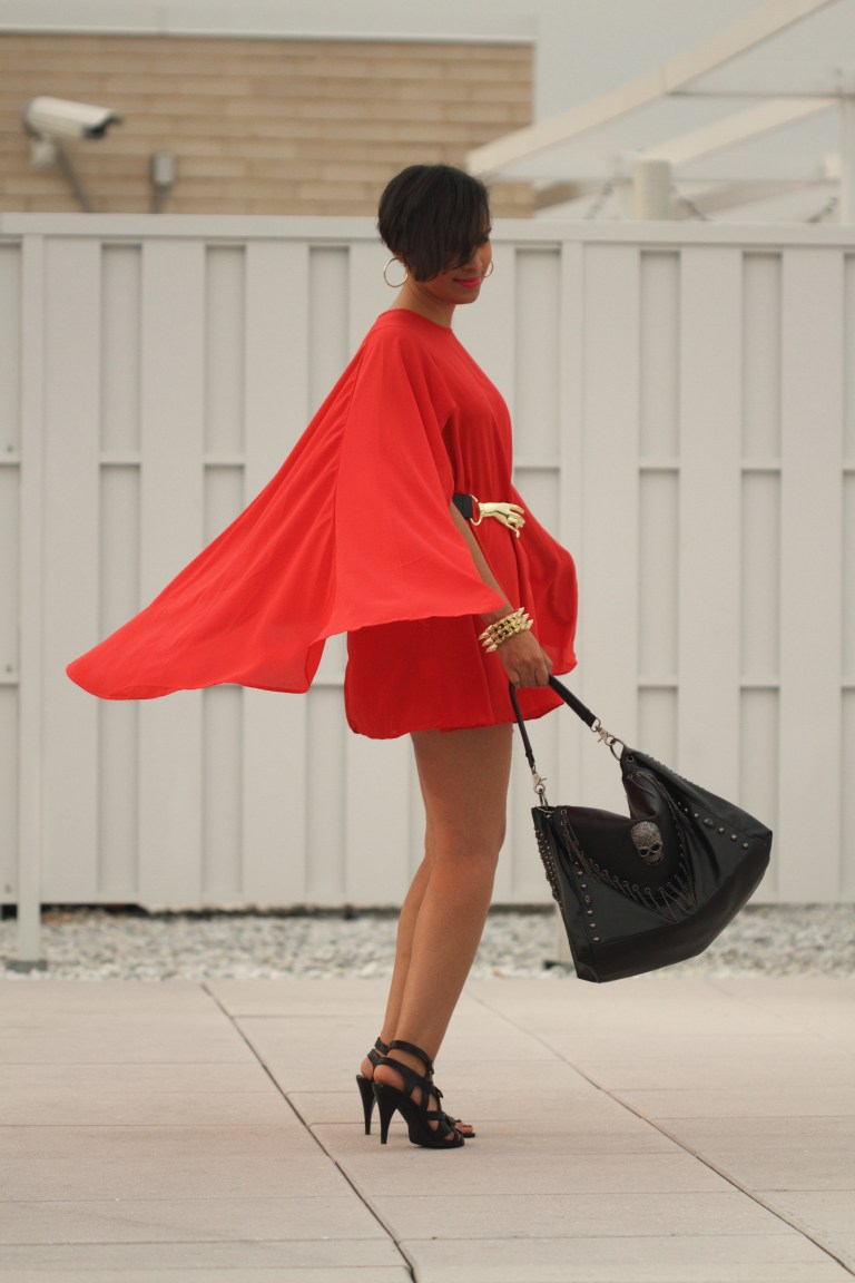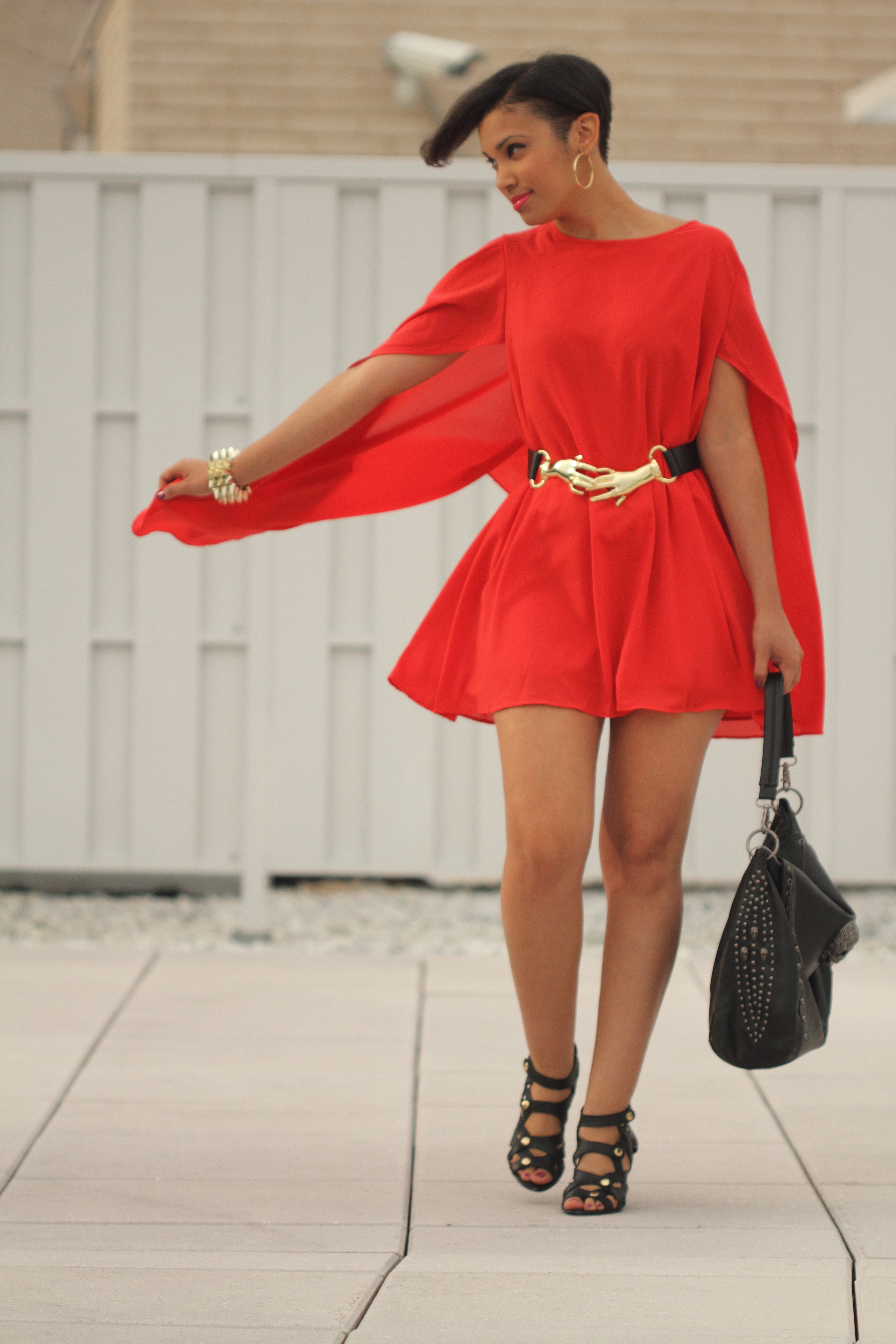 This is the 7th and final look (aw so sad 😦 ) for the Siren London’s “Seven Day Siren Challenge“! I’m wearing the fierce flaming Hero Day Dress. This dress is statement piece. I really love it’s bold bright red color. It has a cape-like top that drapes beautifully over the dress. The chiffon fabric adds movement and drama as you walk! LOVE! LOVE! The dress is very full so I added a belt to cinch the waist for more shape and then added a few other gold accents. I’m also wearing my newest obsession the Rhianna bag.
