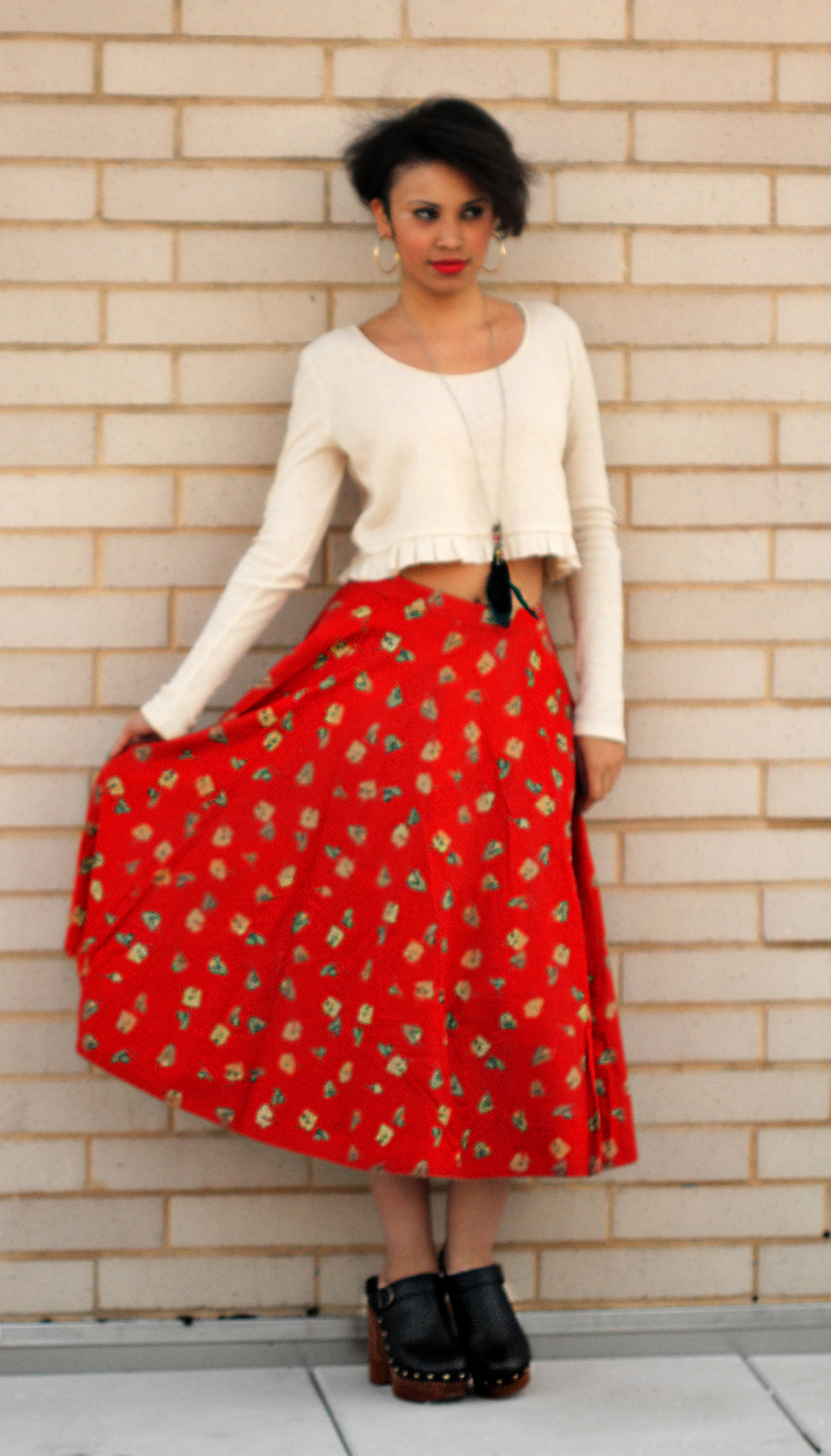 I had a good time in Free People this past weekend…maybe a little too good! hehe They had great items on their sale rack plus an additional 10% all sale items! RING DING! I smell a bah-gain! I purchased this thermal ruffle crop top and  “Loving Fall” skirt for a total of $37! I added a feather necklace a gift from the BF and some JC clogs.