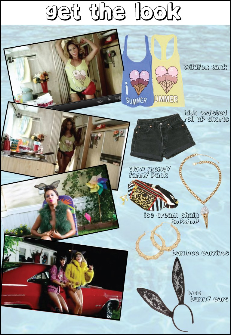 “Party” has an old school sound and old school styling. Bright colors, lashings of lipstick, costume jewelry, short sets and a good fanny pack is all you need to recreate this video look! I love the tempo of this song and her old school moves. hehe Get it Yonce! Nope, “Yonce” is not a typo. I just think the name “Yonce” fits her better than “BEyonce” for this video. Yonce” sounds more like an around away girl nickname 🙂 This track was produced by Kanyeezy!
