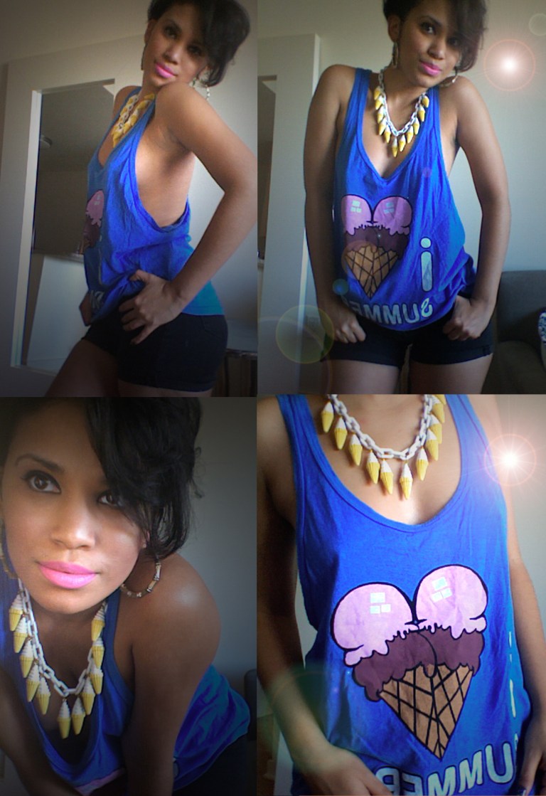 Beyonce’s new video for the song entitled “Party” brings me back to the 1990’s, when I was listening to SWV, TLC and my very first cassette tape “Summertime” by Will Smith & Jazzy Jeff. Ahhh memories! What do you do when it’s snowing outside in October? DUH! Pretend its summer inside! After watching this video I wanted to recreate a fun summer outfit inspired by all her looks!  Besides, I already have the same tank in blue 🙂 (see my outfit deets and the music video below)