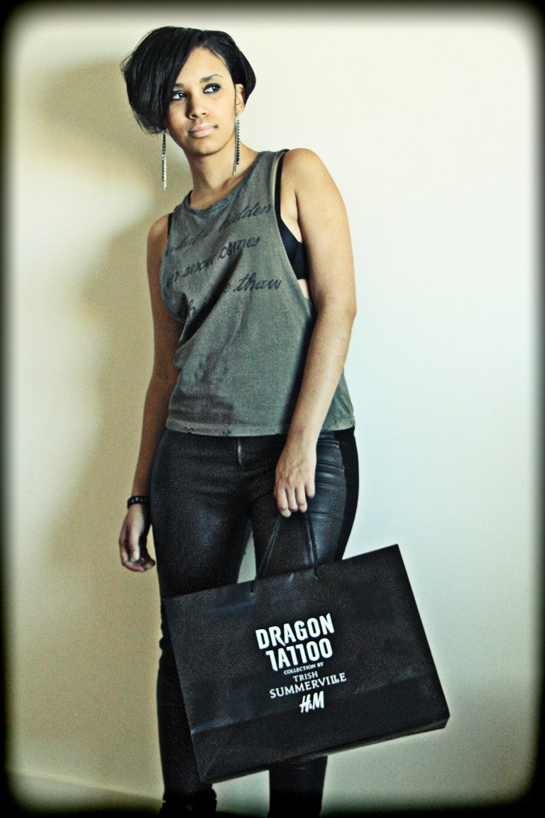 Last week was the release of “The Girl With The Dragon Tattoo Collection” by Trish Summerville for H&M. I was very excited to get my hands on this collection. It is so stylish and affordable! I took a break from Xmas shopping and trucked down to the pop-up shop in the Meatpacking District to shop the new collection. I picked up my favorite pieces, the tank, leather leggings and shoes.
