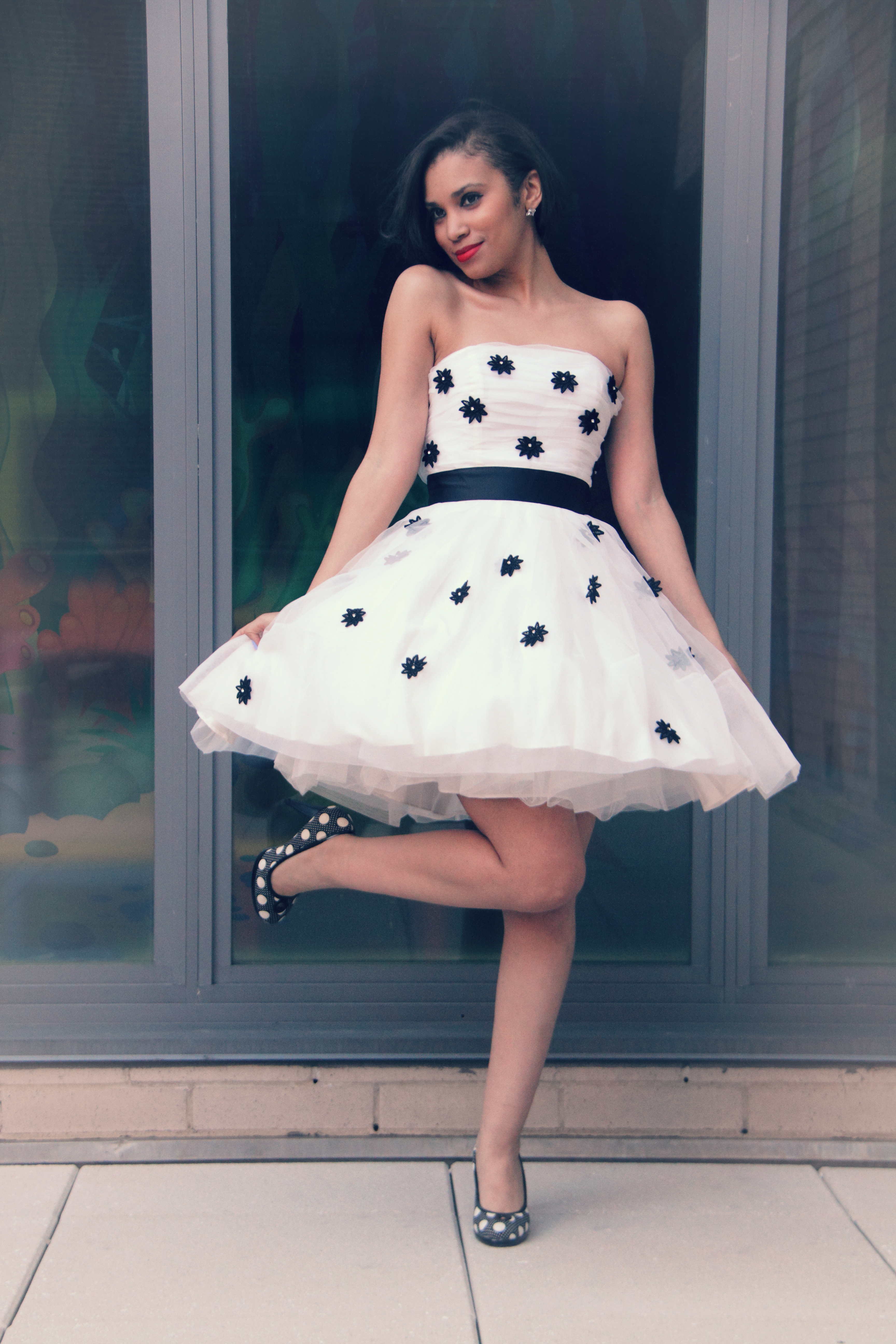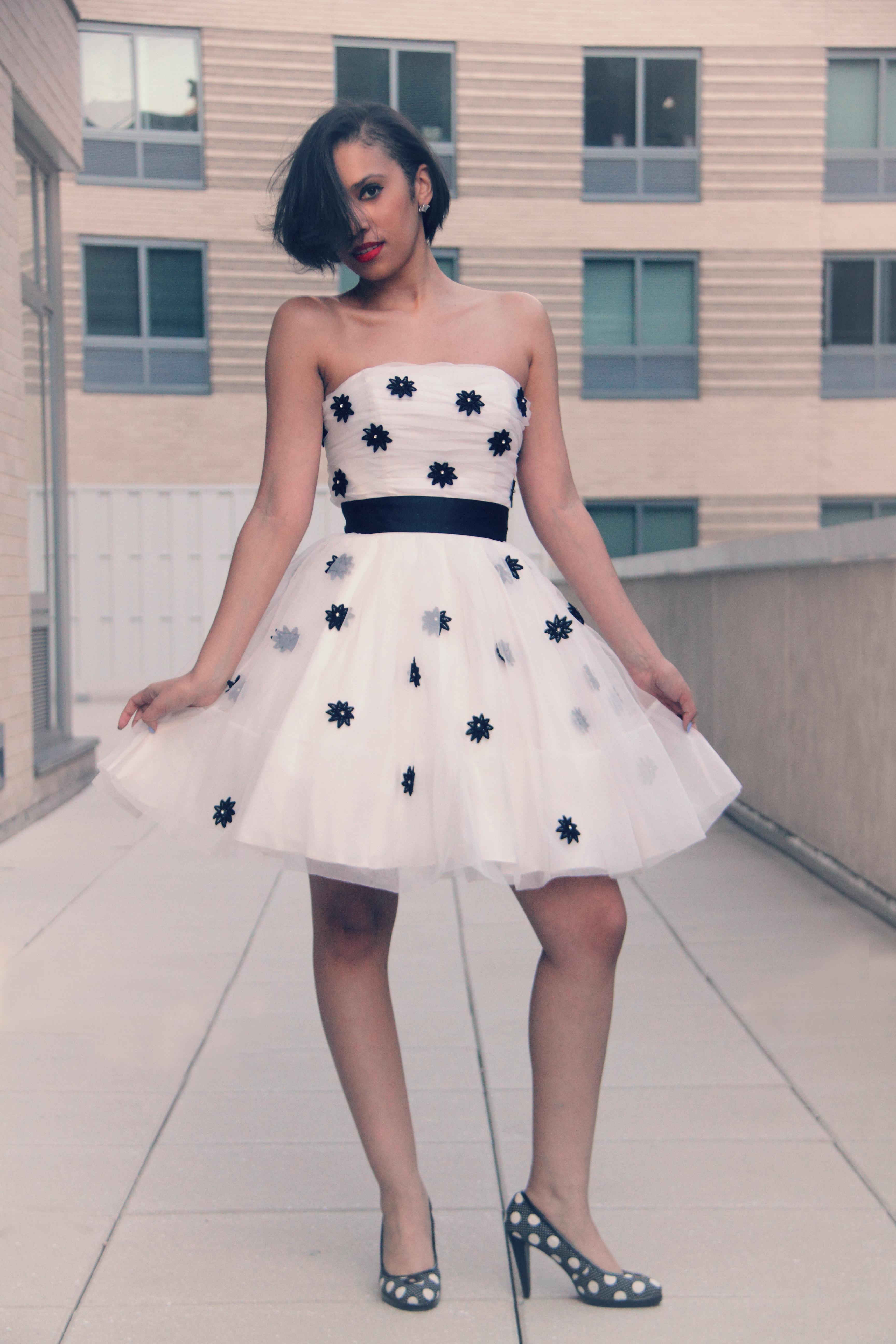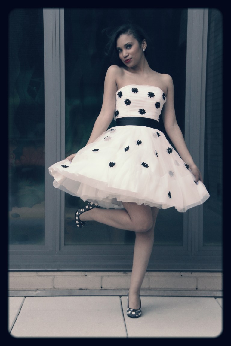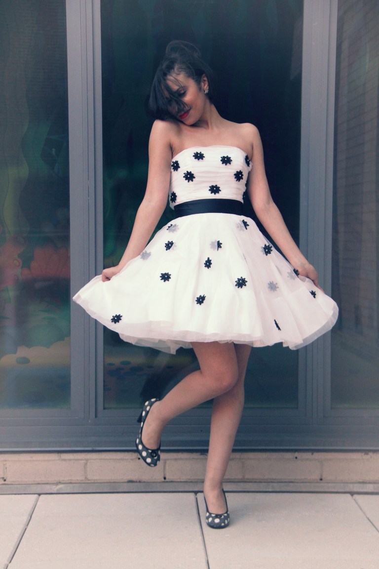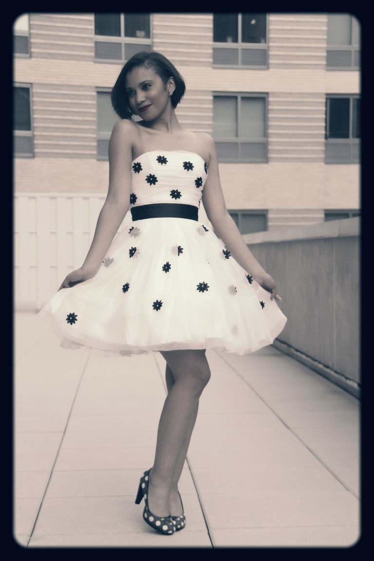 This dress makes me soooo HAPPY! I was lucky enough to find this gorgeous dress from the Betsey Johnson final sample sale (the sale was extended until tomorrow!!!). I spotted this piece of perfection while waiting on line to checkout and I knew I had to have it! I love the classic colors, black and white! The dress is trimmed in black daisies with rhinestones in the middle of the flower to add a pop of sparkle! I think this might be my favorite dress in my wardrobe! Yes, happy girls are the prettiest!