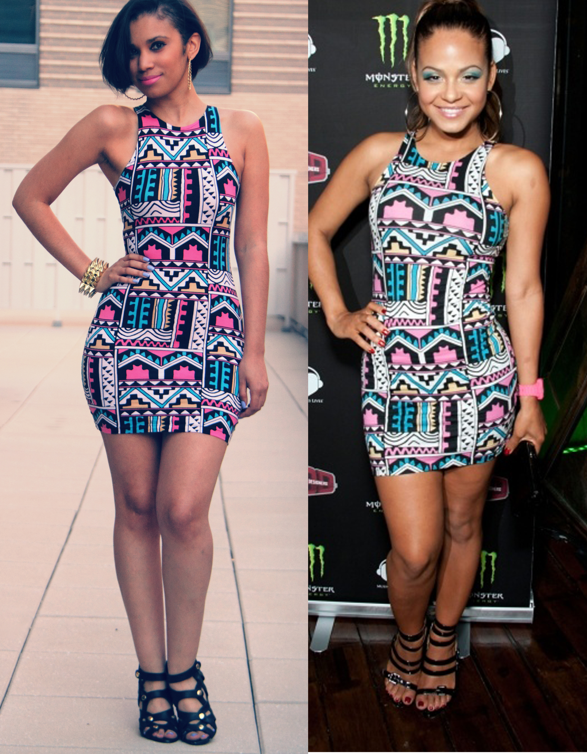 Here’s another celebrity showdown with the lovely geometric pattern Aztec dress by Motel! I absolutely looooooove this dress. I knew I had to have it as soon as I saw it! It has beautiful pastel colors and bold shapes. I’m very thankful for this gift from Motel! It is also a dress co-owned by Christina Milian! I’m starting to realize Christina and I has similar taste in clothing considering I’ve down one other post featuring her style. Here is Christina and I rockin’ the fierce Aztec dress…who rocked it better!?!