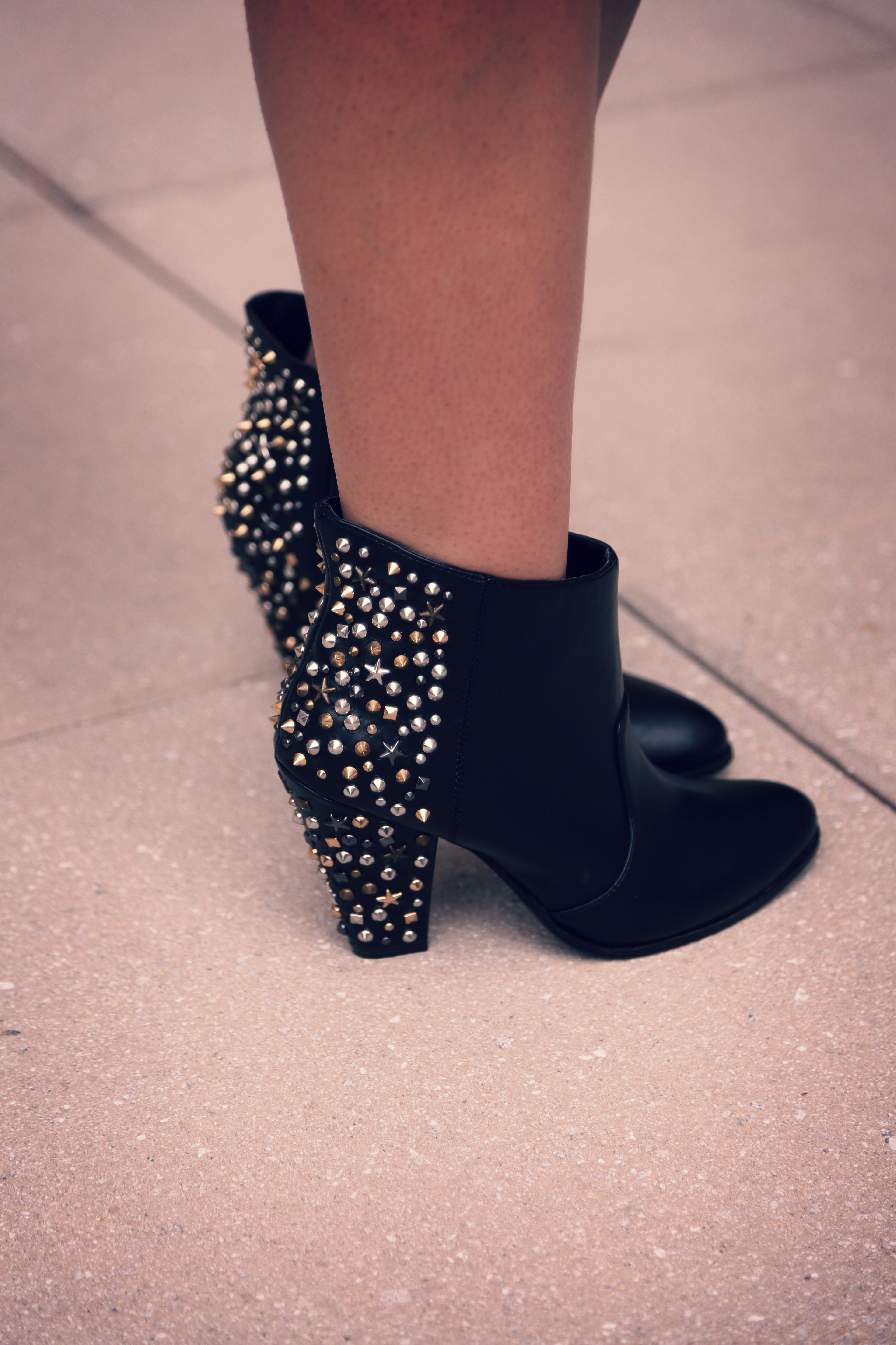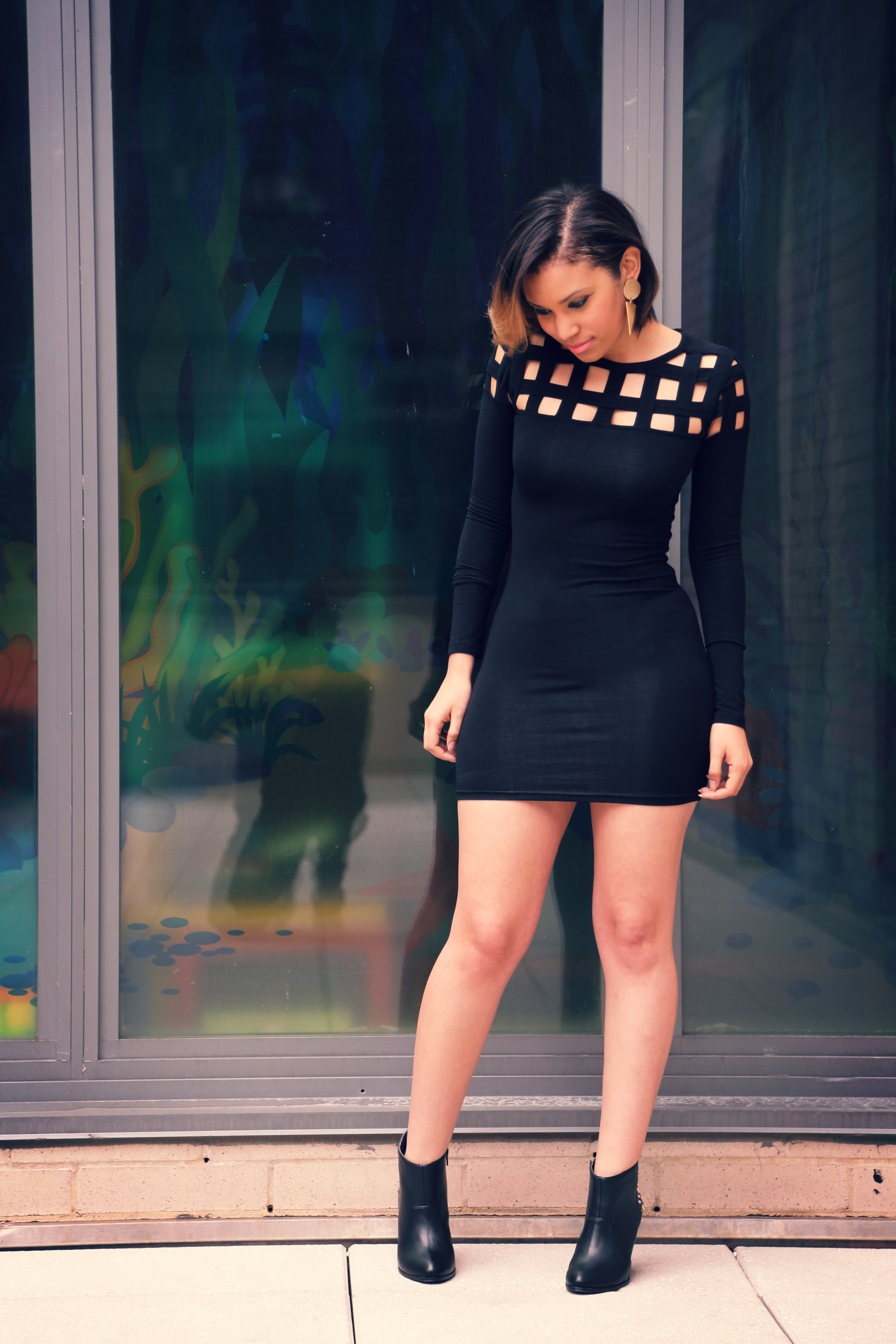 In this outfit post I’m rockin’ the Underground dress by BOTB. This little LBD is a hot number with caged shoulders and neckline. I paired it with studded booties (a lovely gift from my dear friend) from Zara!