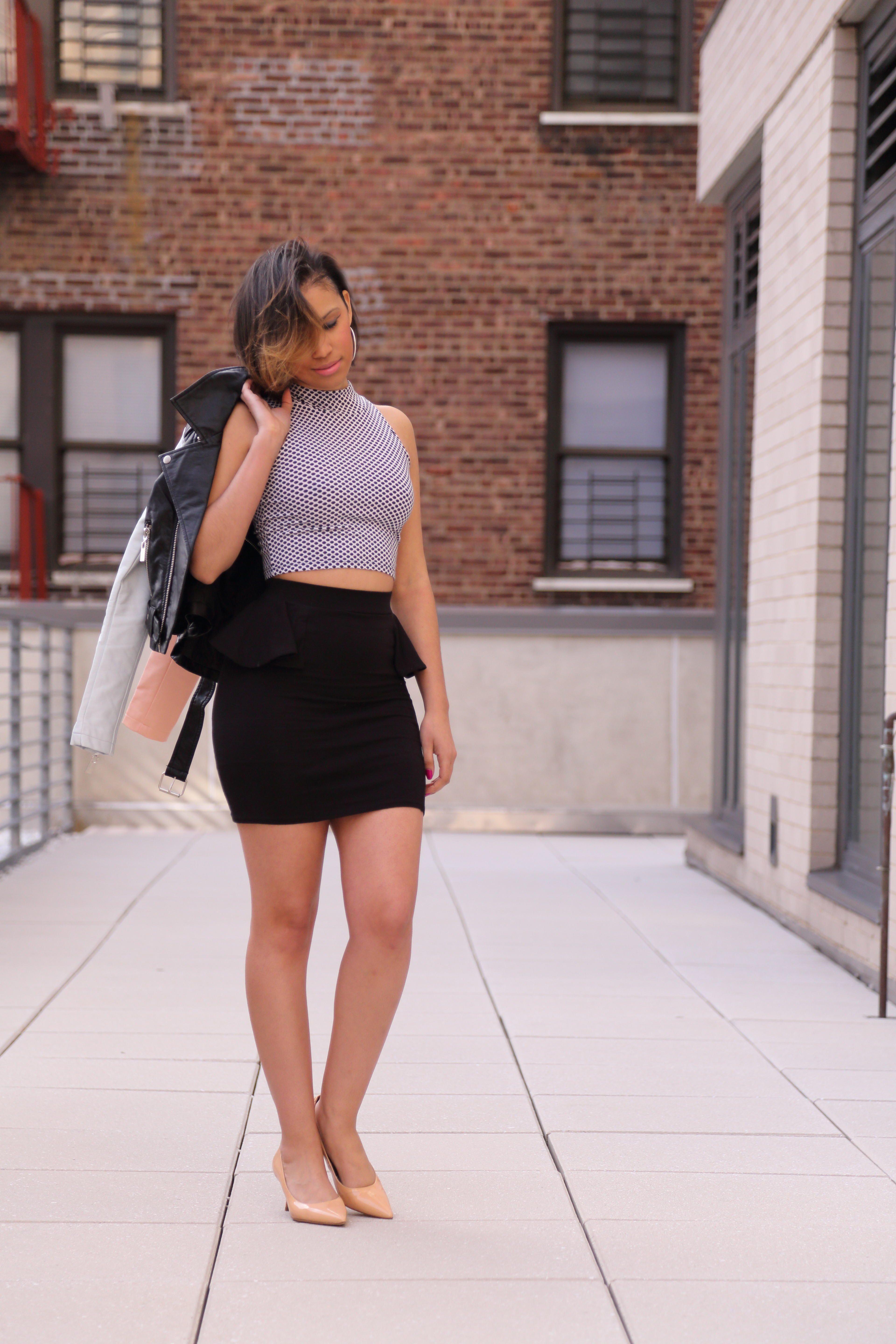 In this outfit post I’m rockin’ the amazing peplum Dita skirt (BAHGAIN ALERT! It was only $19!) by Nasty Gal. I snapped these pics right before the blizzard hit New York. I hope I’ll be able to take more outfit pictures soon once the snow clears. The colors are fresh and previewing Spring in this post. The white & black polka dot along with pastel colors mint and peach accent the black skirt. The crop top is from Motel (my top is sold out but here Β is a similar style) and jacket from NG.