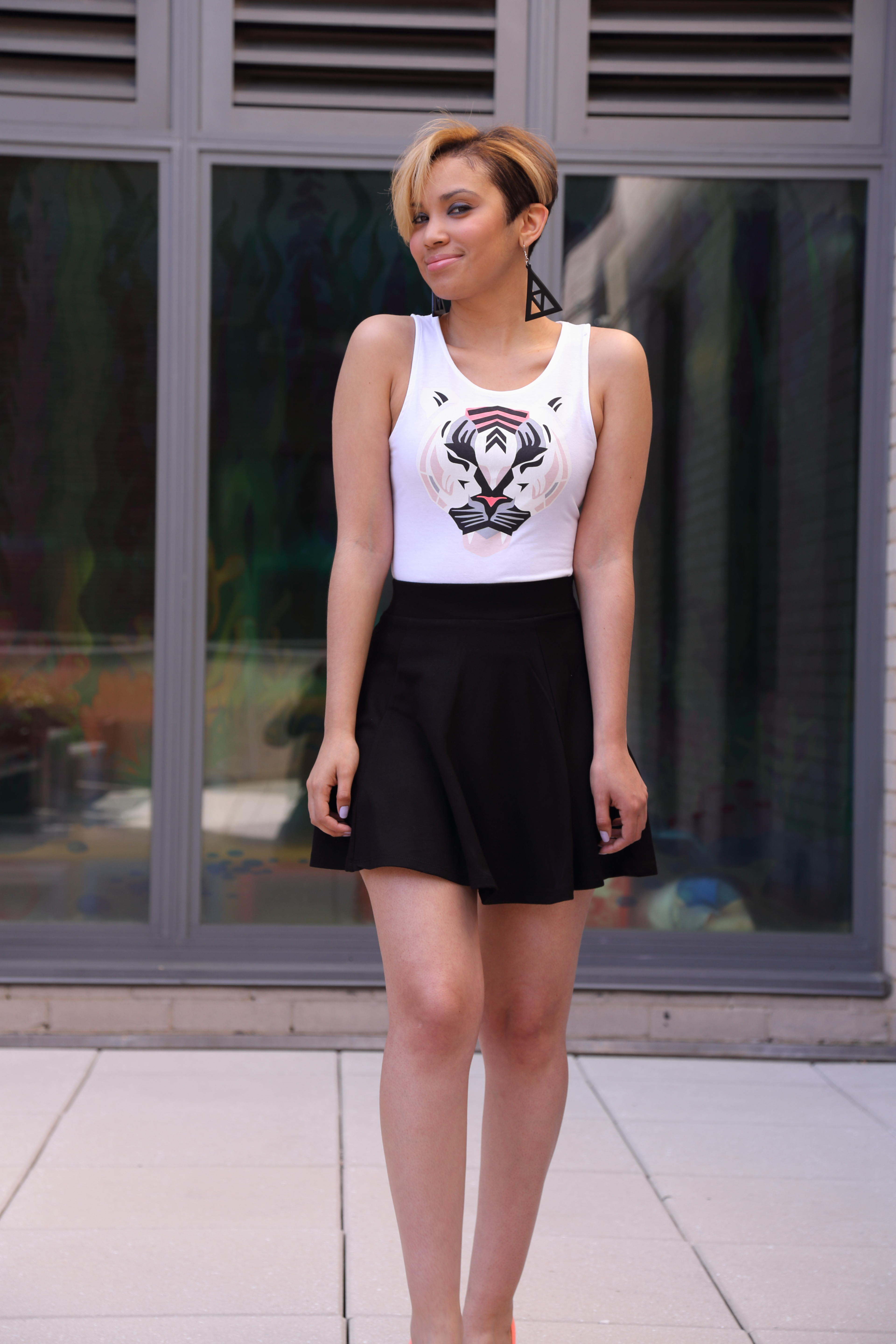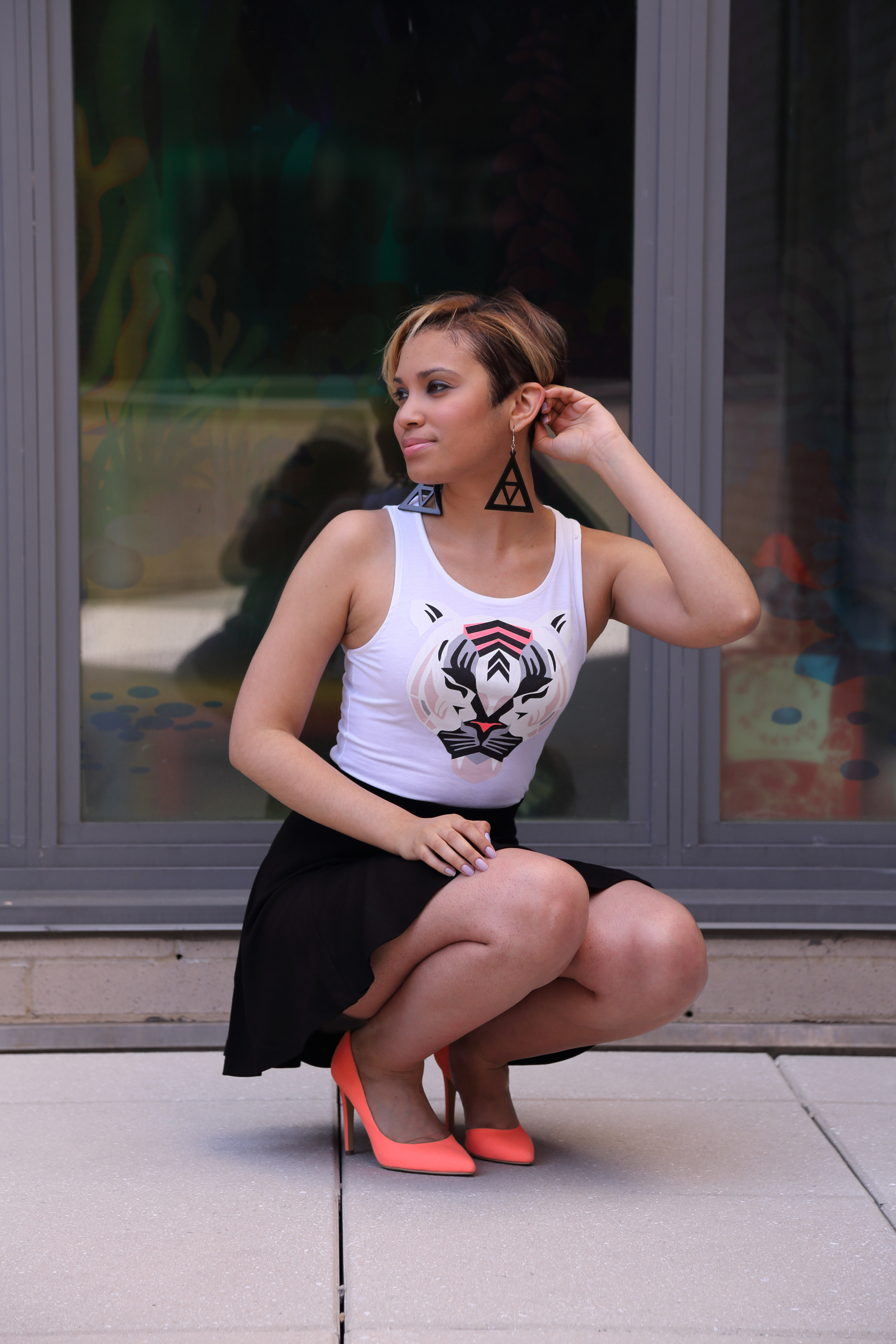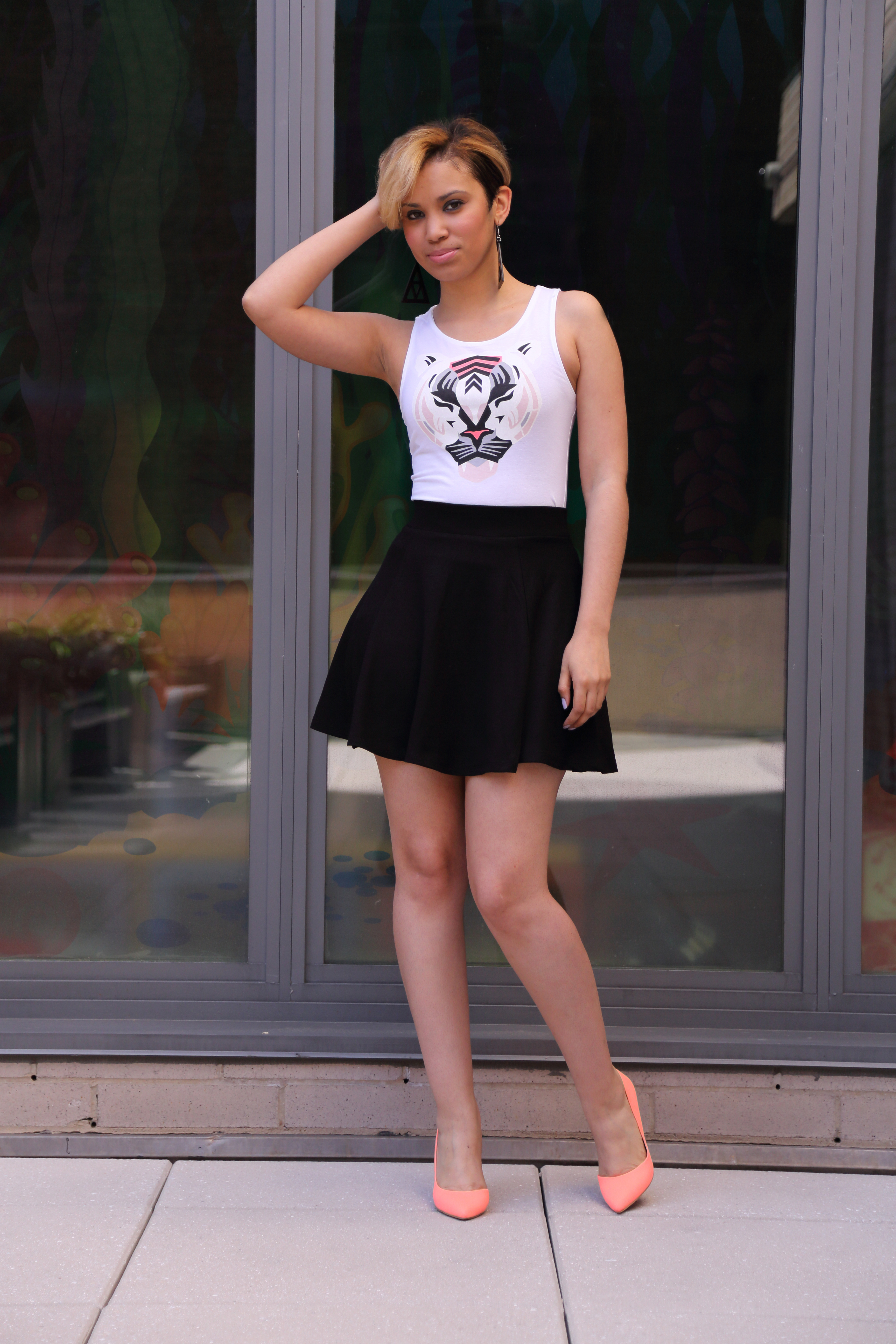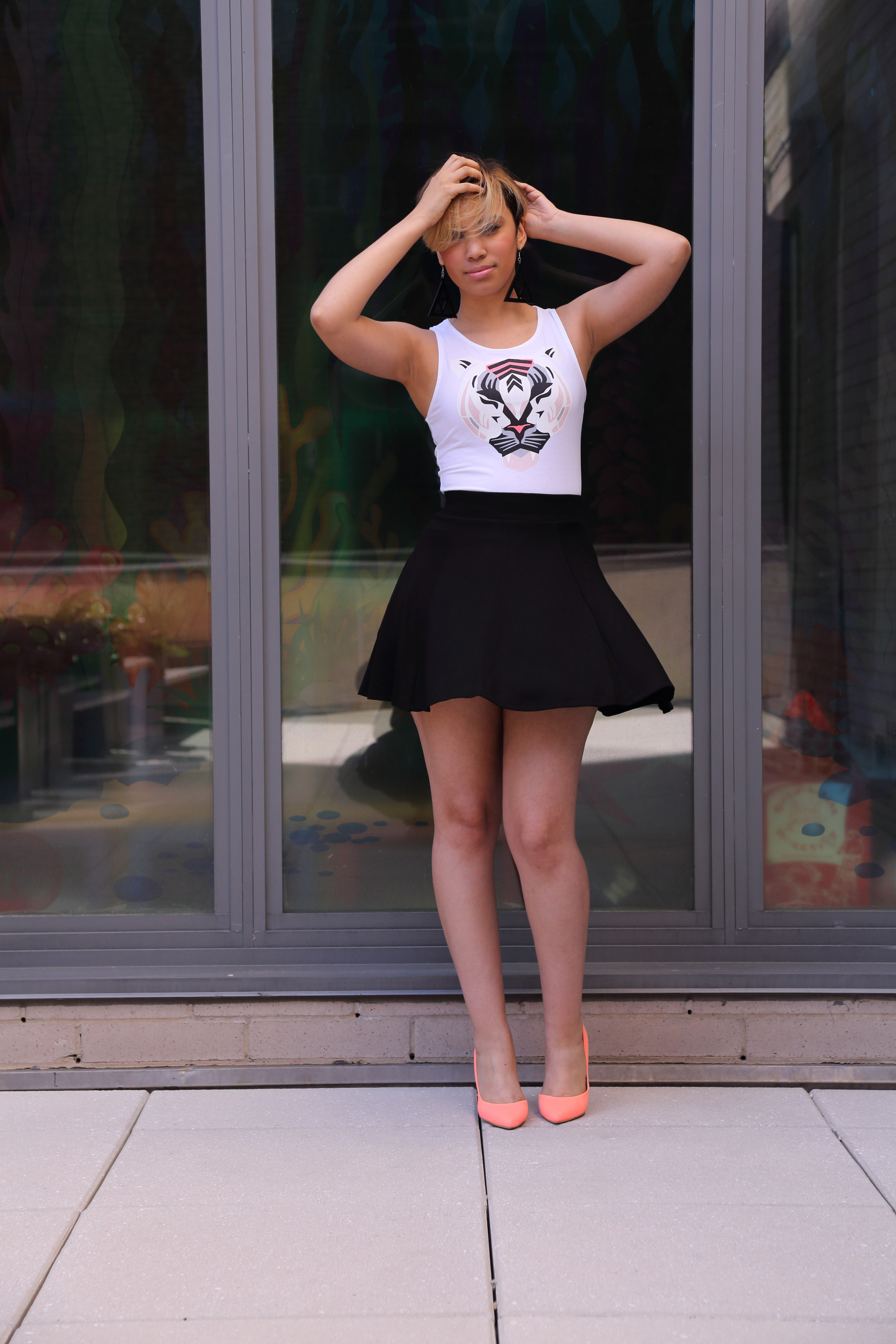 I fell head over heels for these electric neon coral denim pumps by Joe’s Jeans. This color is to die for!!! These pictures don’t do this neon coral color justice. It’s much prettier in person! I also found this adorable tank top with a neon tiger graphic at H&M for only $4.95 BAHGAIN!!! The skirt is also from H&M for $17.95. Earrings are from Topshop. Cheers to Summer and bright colors!!!