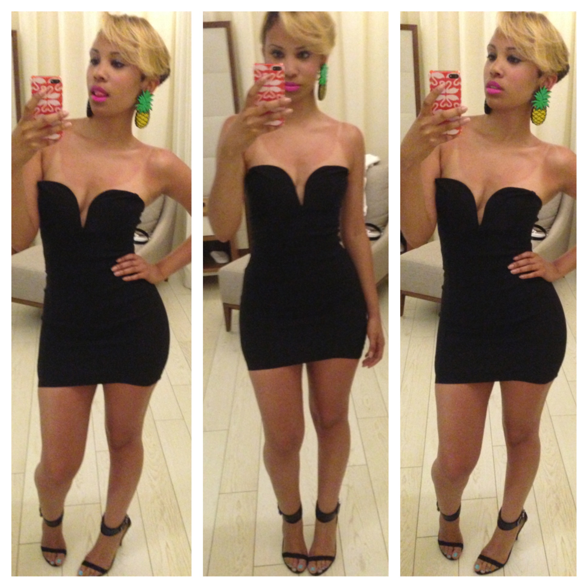 I had a slight obsession with little black dresses while in Mexico. I spotted the “Helix” LBD on Nasty Gal. The fit is amazing with a plunging neckline and hi-low hem. The hi-low hem is perfect for hippy curvy girls like me because the dress doesn’t lift in the back and show off your lady parts haha 😉 I LOVE this dress. I wore it out to dinner after a long day by the beach and pool. I paired this sexy dress with my pineapple earrings by Melody Ehsani from Shop Jeen and strappy sandals from Zara.