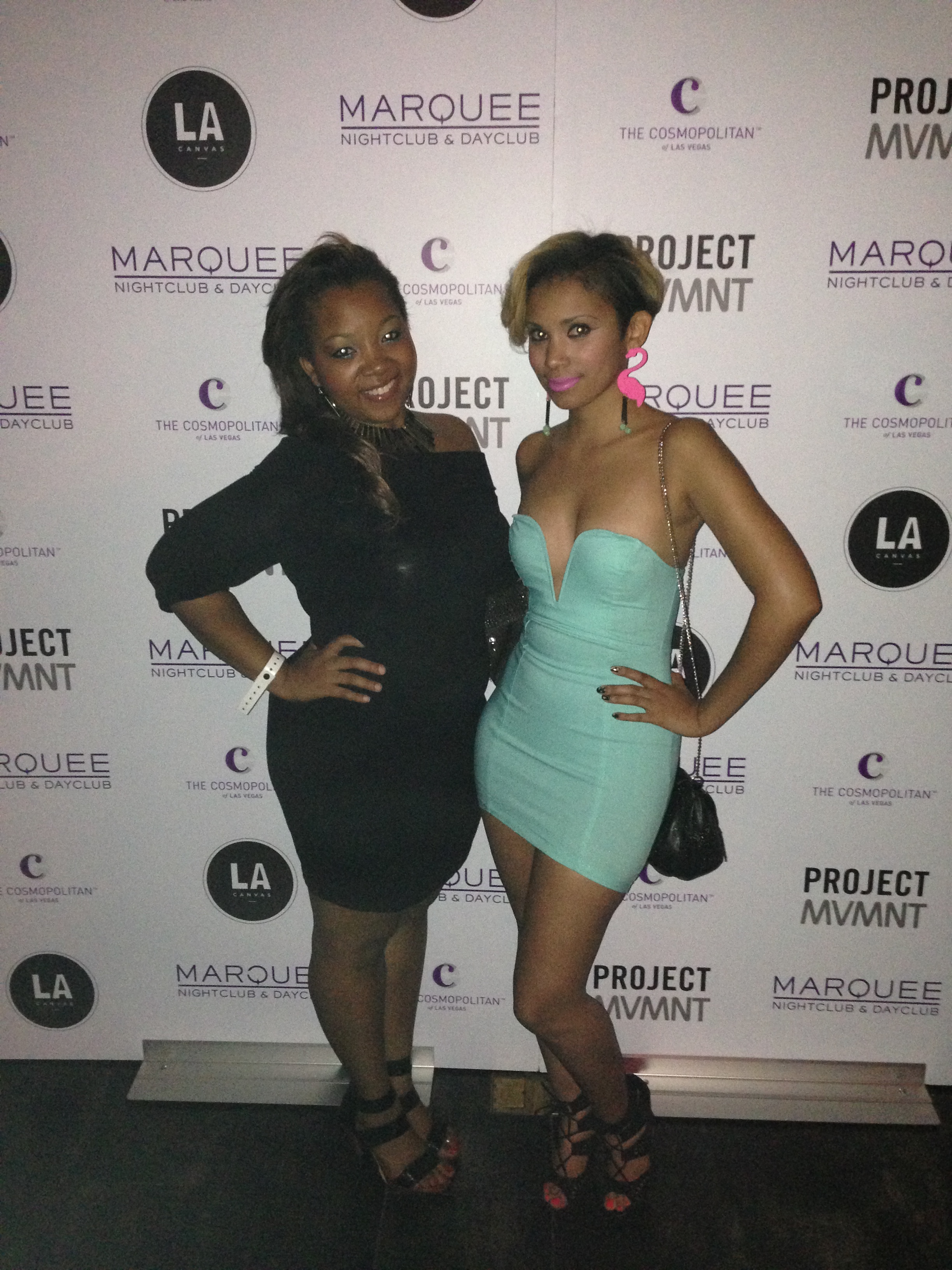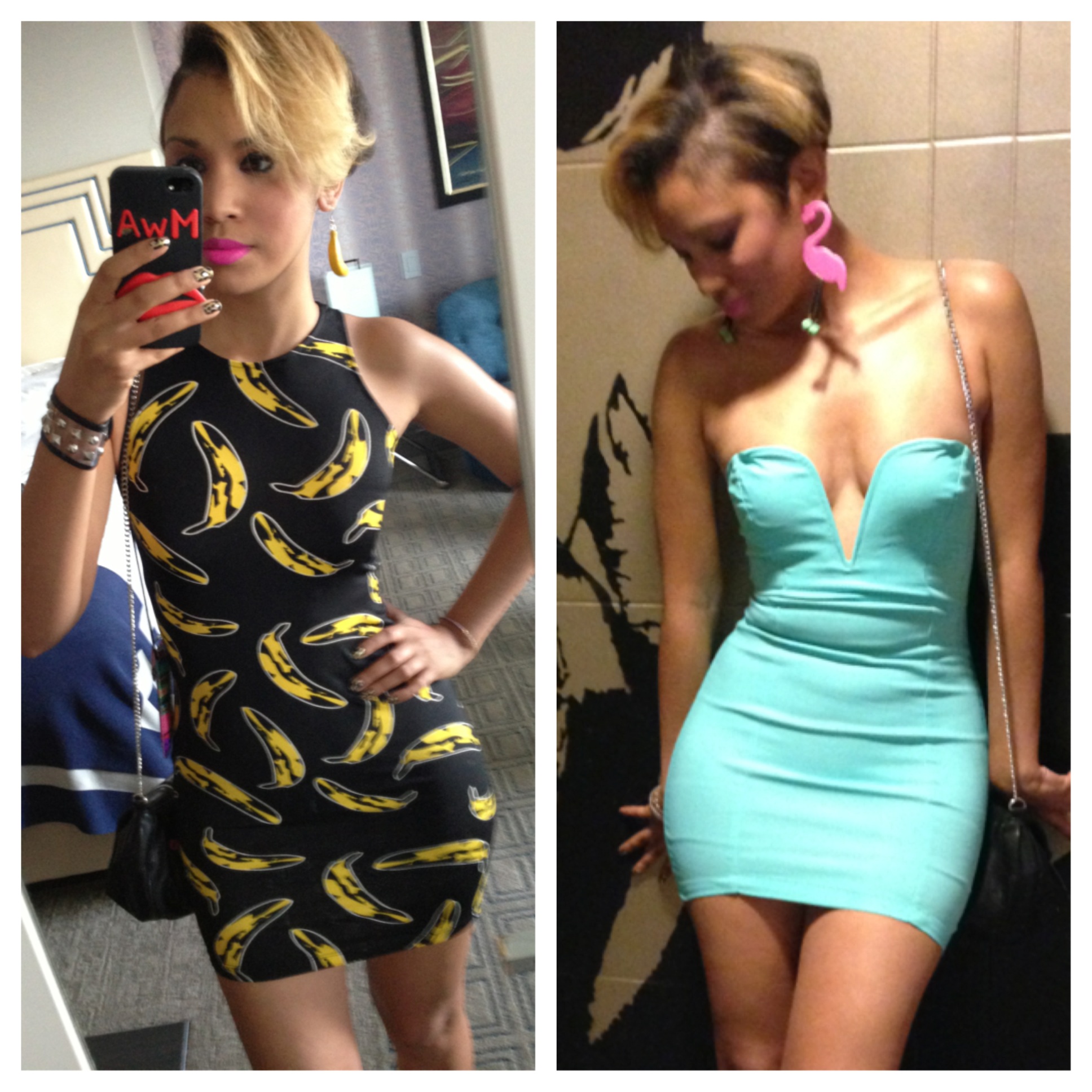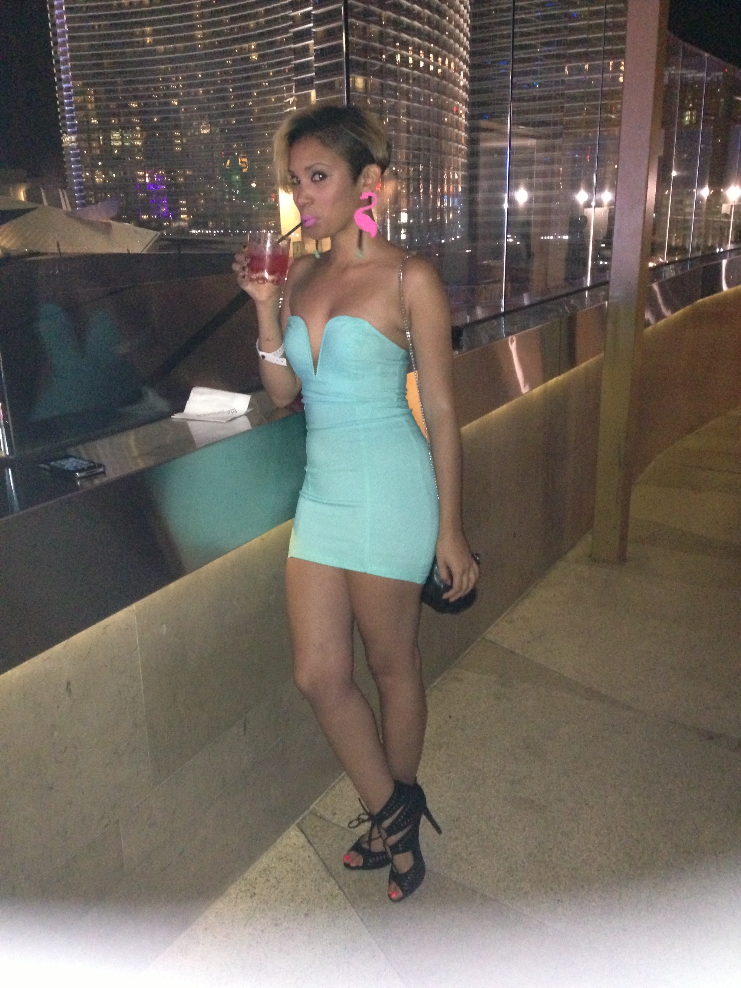 Then after a long day walking the trade shows we went out for some nightlife! We went to the “Streethearts” (Hellz Bellz, Melody Ehsani & Lovemade) afterparty at Marquee and then saw Nas perform at Hakkasan. I wore fancy flamingo earrings by Melody Ehsani and the Helix dress by Nasty Gal.