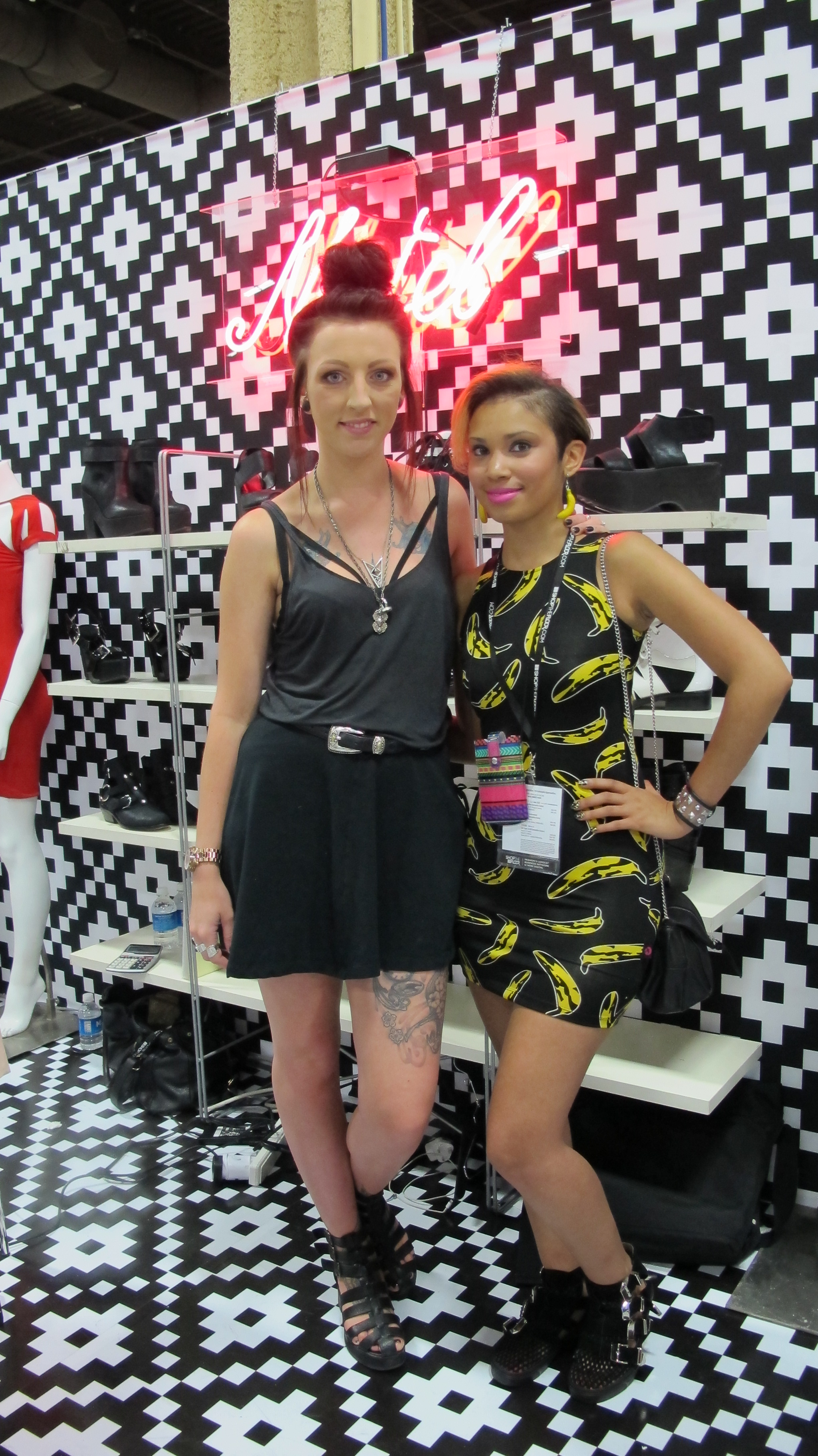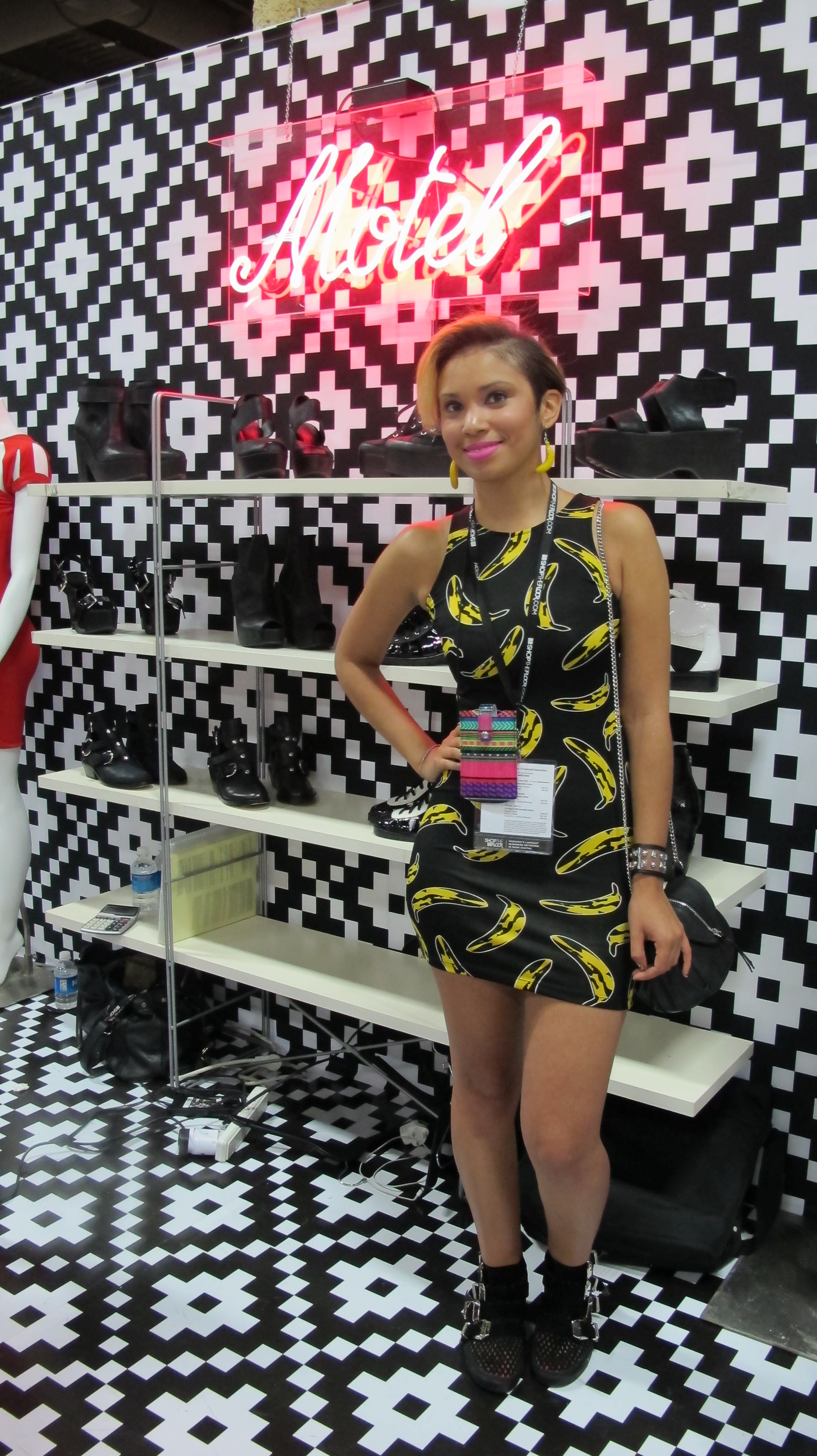 On the first day visiting the Magic Trade Show I wore a banana dress by Kuccia and banana earrings from Girl Props. I also rocked Jeffrey Campbell shoes. I love the silver buckles! I walked the Pool Trade show where I spotted my beloved clothing brand Motel Rocks’ booth. You know I had to stop by to show them some love and see their new collection.