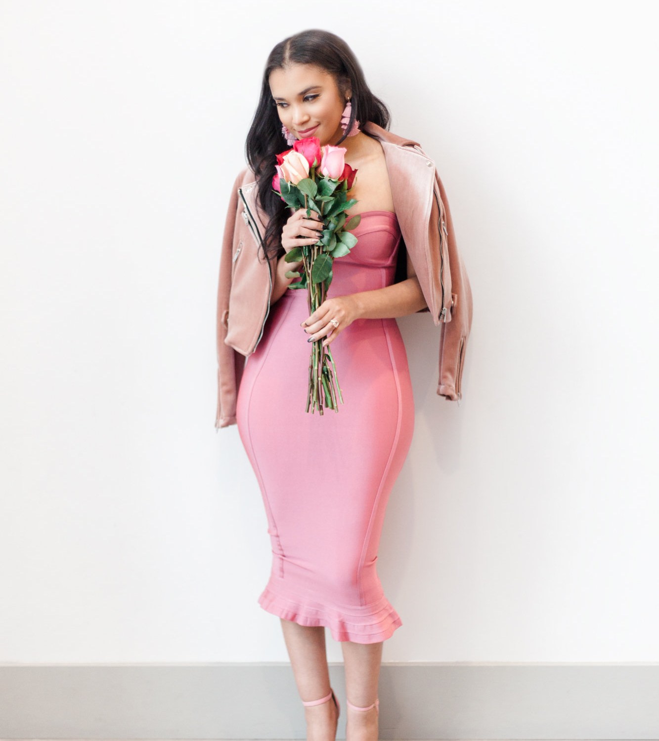 Outfit deets: dress from Pretty Little Thing, shoes from Pretty Little Thing, jacket by Bershka