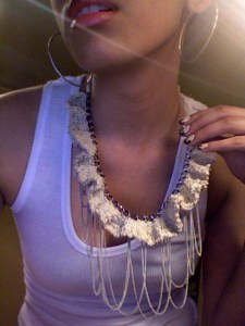 Pics of Spikes wearing her Ma Petite Plume “Victorian Grunge” necklace. It’s perfect with jeans and pumps for a casual night on the town 😉